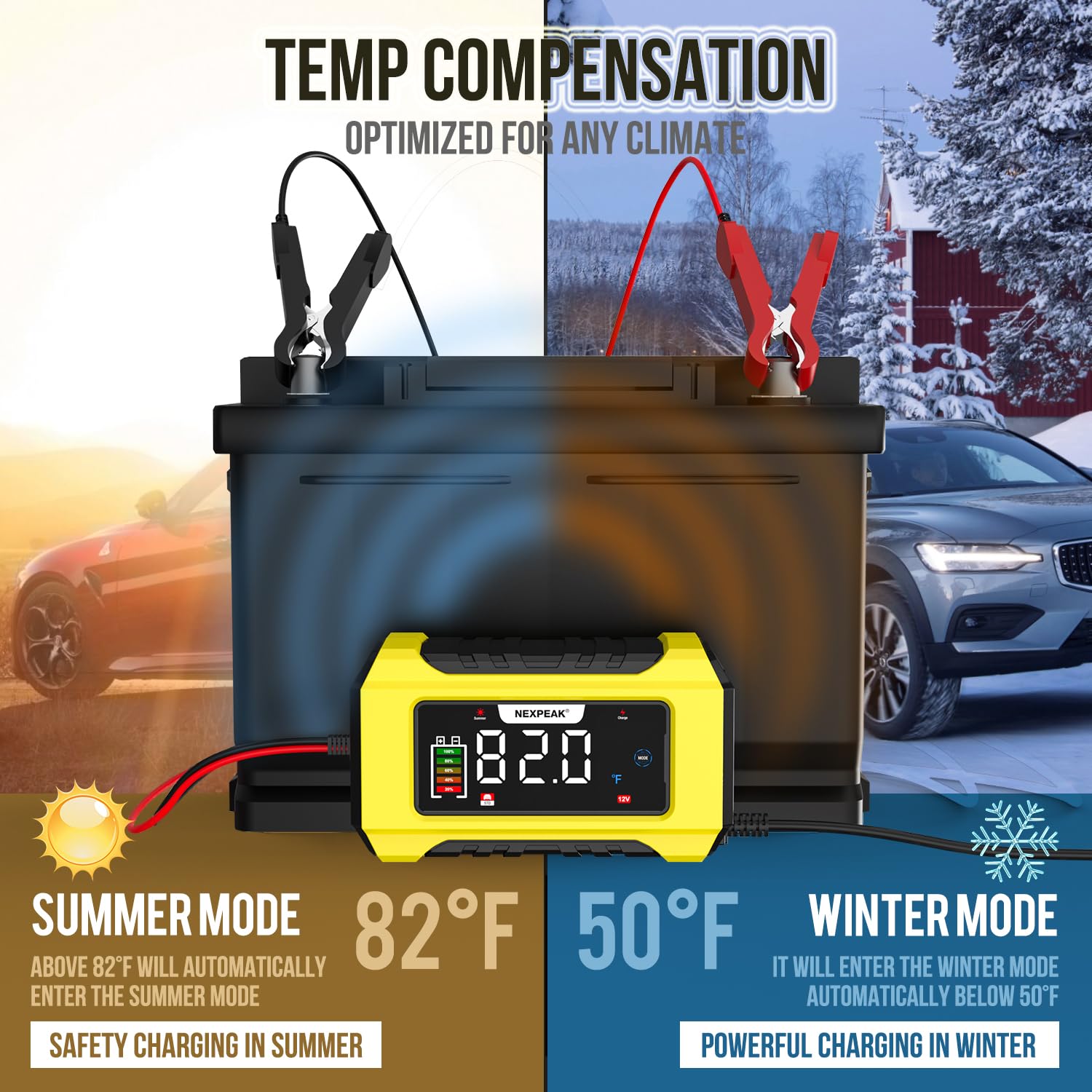Carregador de Bateria NEXPEAK NC215 15A – Carregador Trickle 12V 24V LiFePO4 e Ácido Chumbo, Manutenção Inteligente 9 Estágios com Compensação de Temperatura para Carros e Caminhões