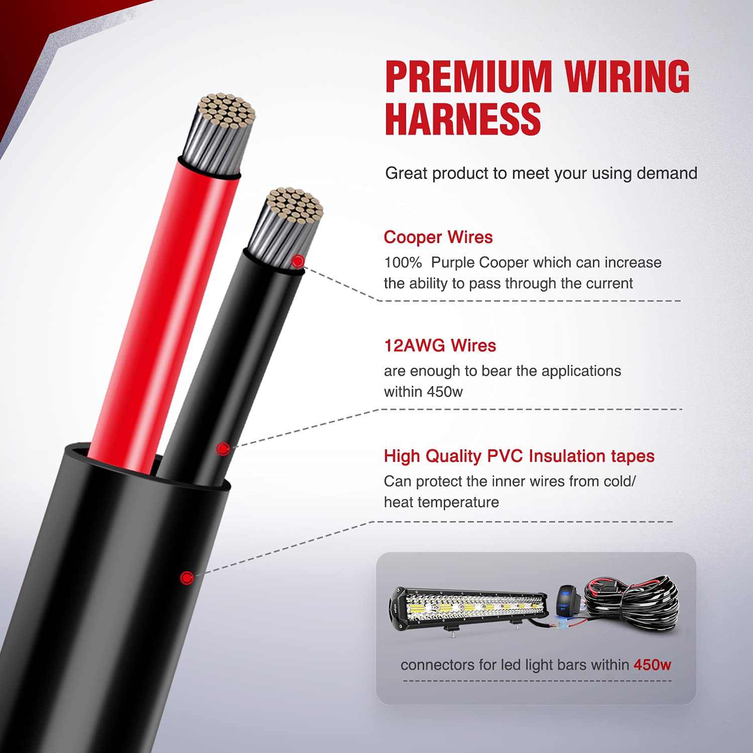 Este kit de fiação é equipado com um relé de potência que proporciona proteção eficiente, evitando sobrecargas e curtos-circuitos. O fusível de lâmina incluído no kit é uma garantia adicional de segurança, permitindo que você utilize sua barra de LED com confiança. A qualidade do material é excepcional, com uma condutividade elétrica superior e resistência a altas temperaturas, o que resulta em uma vida útil prolongada do produto.