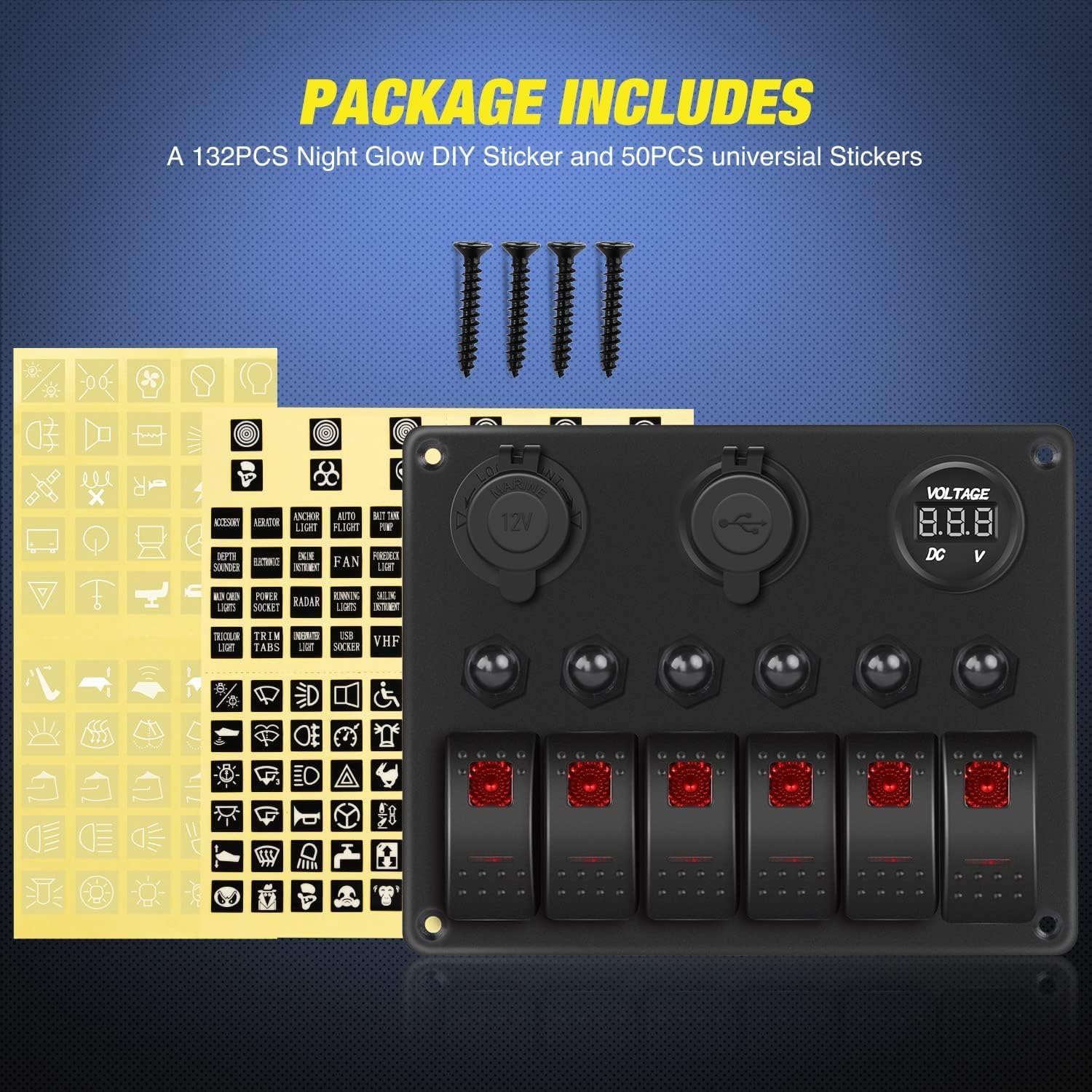 Cada um dos 6 interruptores rocker é classificado para 12V a 20A e 24V a 10A, permitindo que você conecte até 12 cargas, desde que não excedam a classificação de corrente de cada interruptor. Por exemplo, você pode conectar 2 pods LED no interruptor 1, uma barra de luz LED no interruptor 2, luzes de subiluminação no interruptor 3, um ventilador de resfriamento no interruptor 4, luzes laterais no interruptor 5 e 2 luzes de chicote no interruptor 6. O painel também inclui 2 folhas de etiquetas: uma normal e outra que brilha no escuro, permitindo que você personalize o controle dos aparelhos elétricos do seu veículo.