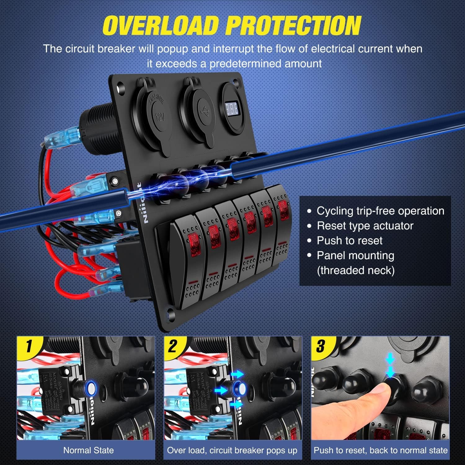O painel de interruptores Nilight 6 Gang ON Off Rocker Switch Panel é a solução ideal para quem busca controle e praticidade em veículos como carros, RVs, SUVs, ATVs, UTVs, 4X4, motocicletas, caminhões, Jeep Wrangler, barcos e iates. Este painel é uma integração perfeita de tecnologia e funcionalidade, combinando 6 interruptores rocker, 6 disjuntores, um soquete de isqueiro, um carregador USB duplo e um voltímetro LED. Com uma capacidade de operação de 12V e 24V, ele atende a todas as suas necessidades de controle de circuitos, monitoramento de voltagem e carregamento.