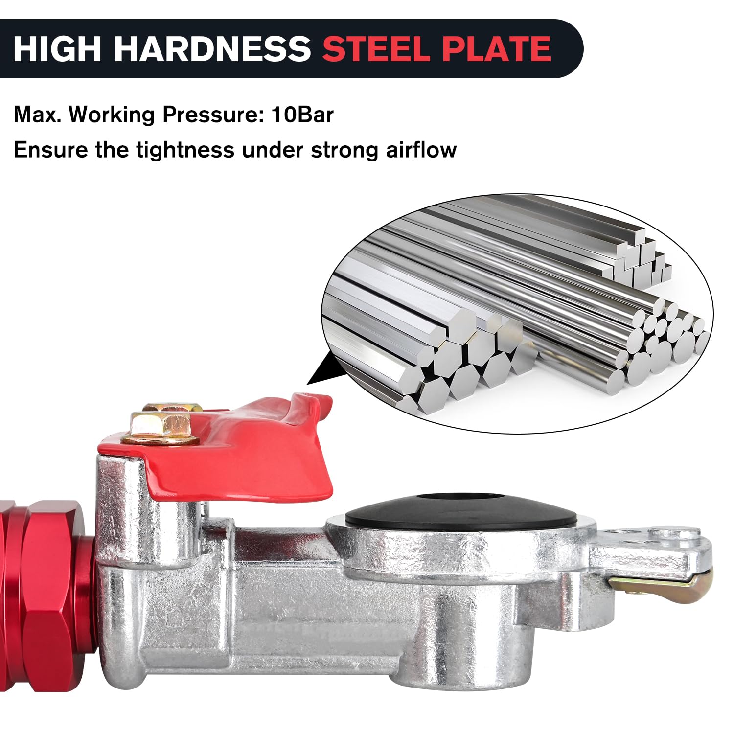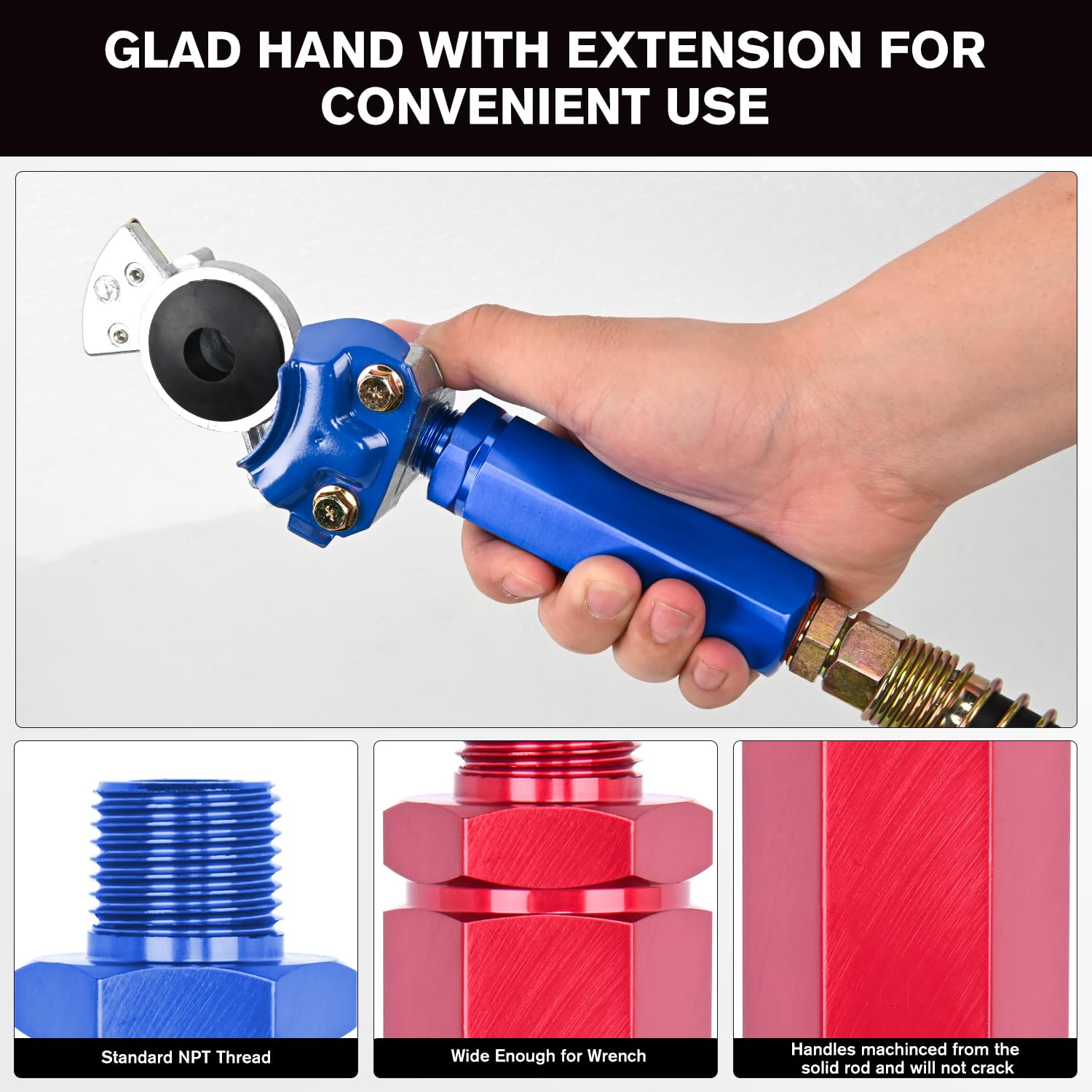 • Manoplas de Alta Resistência: As manoplas de extensão são fabricadas em alumínio extrudado de primeira linha, um material que se destaca pela durabilidade e resistência a quebras. As alças hexagonais largas proporcionam uma aderência superior em comparação com as alças cilíndricas pequenas, oferecendo maior alavancagem para facilitar o acoplamento e desacoplamento das linhas de ar.
