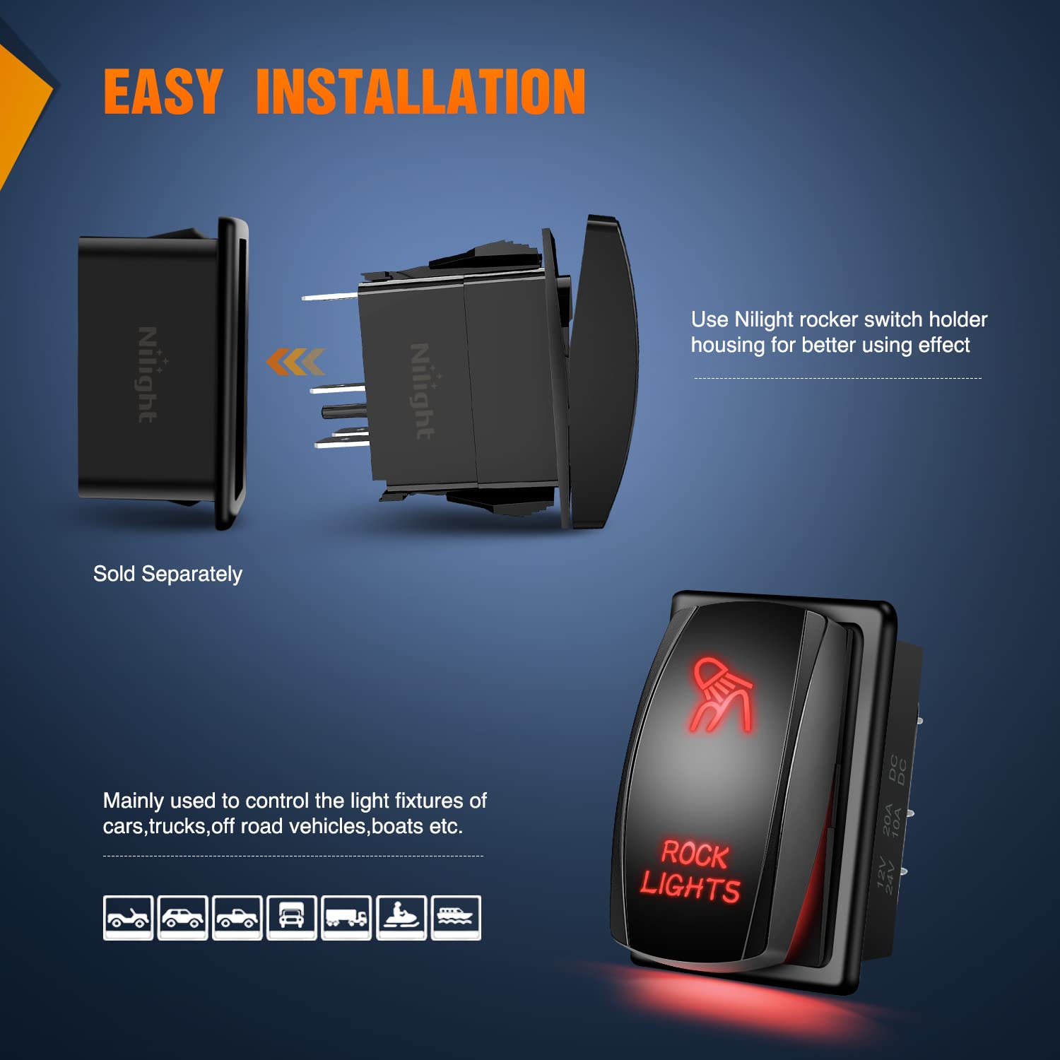 A durabilidade é outro ponto forte do Nilight Rock Lights Rocker Switch. Fabricado com plástico de alta qualidade e pinos bem condutores, este interruptor é projetado para resistir ao desgaste do uso diário. O padrão laser-etching garante que a marcação não desbote com o tempo, mantendo a estética e funcionalidade do produto.