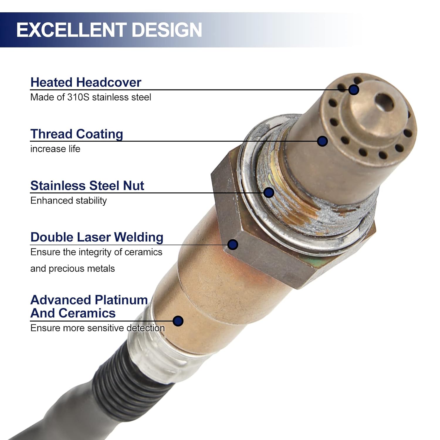 - DESIGN INTERNO E EXTERNO: O sensor JOYOMSTW possui um aquecedor embutido que acelera a ignição e melhora a eficiência do combustível. Com cerâmica branca que suporta até 650 °C, o chip OEM melhora a precisão, enquanto a membrana respirável garante que o sensor permaneça isolado.
