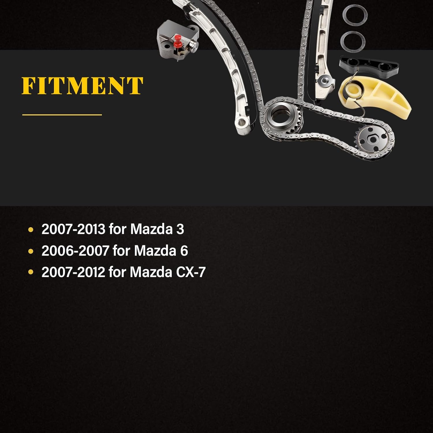 O Kit de Corrente de Distribuição OCPTY é a solução ideal para quem busca qualidade e desempenho para os modelos Mazda 3, CX-7 e 6 com motor 2.3L. Este kit é compatível com os seguintes veículos: Mazda 3 de 2007 a 2013, Mazda 6 de 2006 a 2007 e Mazda CX-7 de 2007 a 2012. Cada componente deste kit foi produzido sob rigorosos padrões de qualidade, garantindo que atenda ou supere os requisitos de desempenho originais (OEM) em termos de fabricação e material.