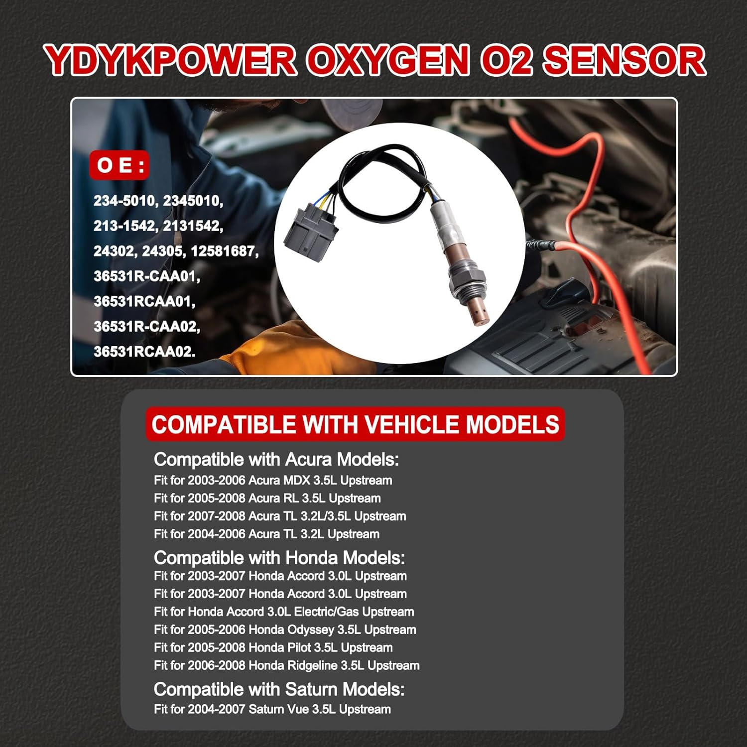 - Compatível com Modelos de Veículos: O sensor YDYKPOWER O2 234-5010 é uma substituição para Acura MDX 3.5L (2003-2006), RL 3.5L (2005-2008), TL 3.2L/3.5L (2007-2008), TL 3.2L (2004-2006); Honda Accord 3.0L (2003-2007), Accord 3.0L Elétrico/Gas, Odyssey 3.5L (2005-2006), Pilot 3.5L (2005-2008), Ridgeline 3.5L (2006-2008); Saturn Vue 3.5L (2004-2007); entre outros.