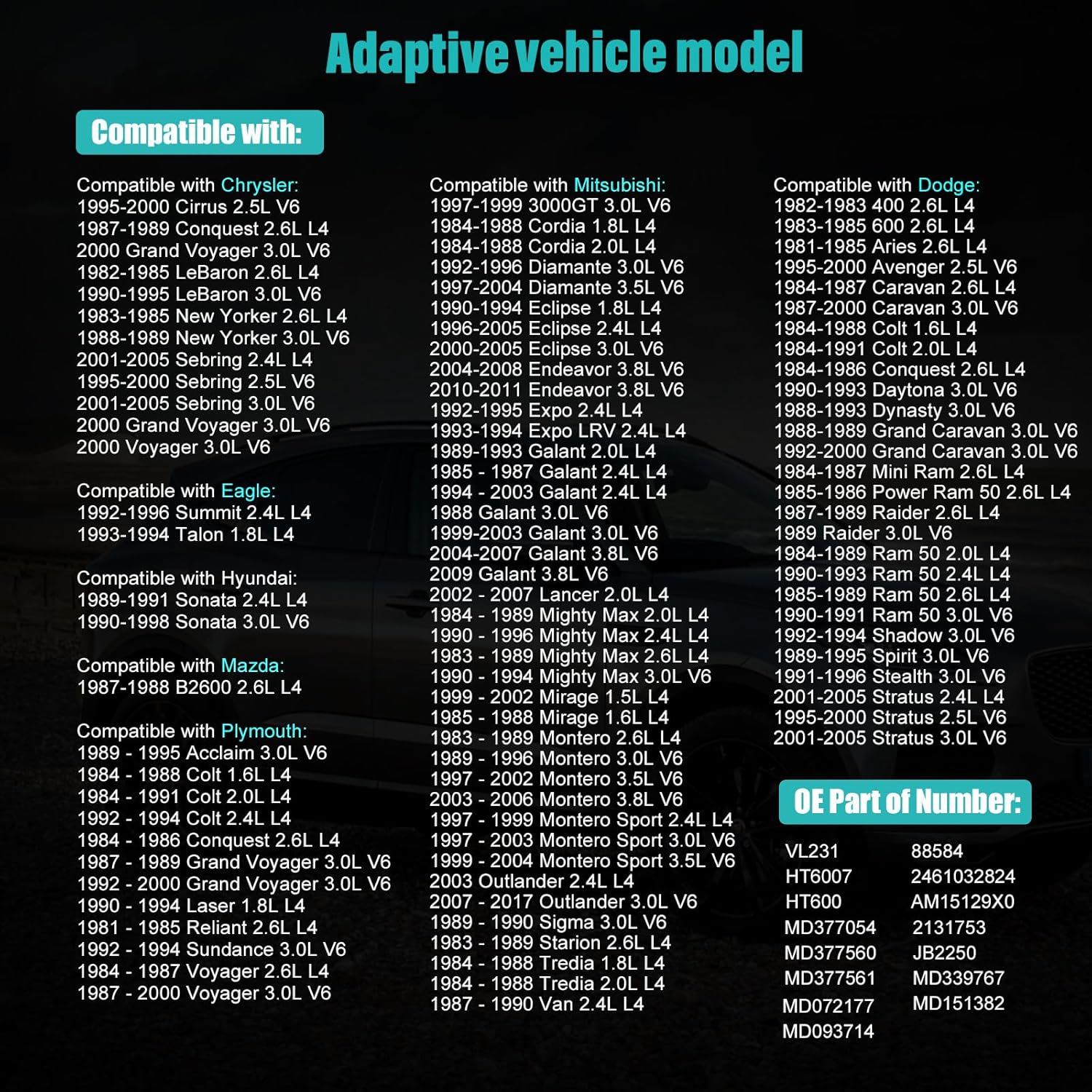 – Compatibilidade: Projetado para uma vasta gama de veículos Chrysler, Dodge, Mitsubishi e Plymouth, abrangendo motores de 1.5L a 3.8L.