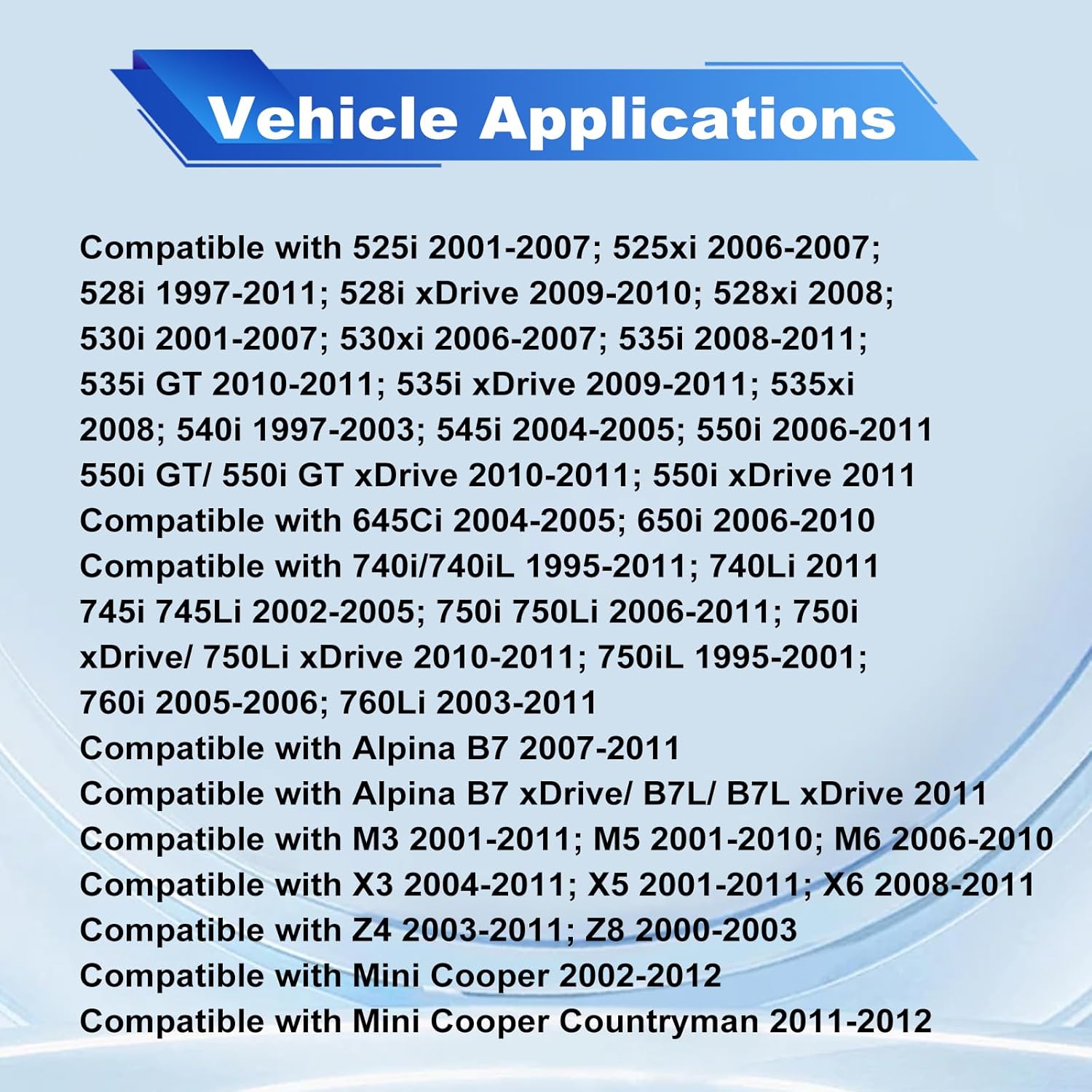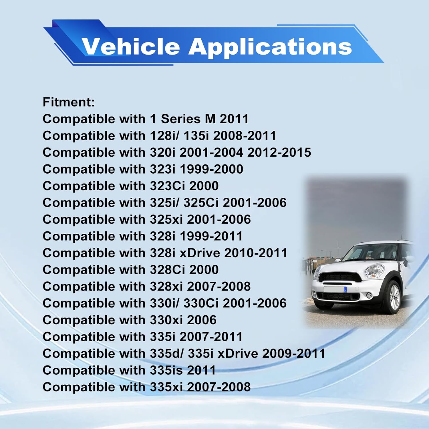 Este sensor é compatível com uma ampla gama de modelos, incluindo a Série 1 M (2011), 128i (2008-2011), 135i (2008-2011), 320i (2001-2004 e 2012-2015), 325i (2001-2006), 328i (1999-2011), 335i (2007-2011), entre outros. A lista de compatibilidade se estende a veículos como 525i (2001-2007), 530i (2001-2007), 740i (1995-2011), M3 (2001-2011), X5 (2001-2011) e muitos outros, incluindo modelos da Mini Cooper.