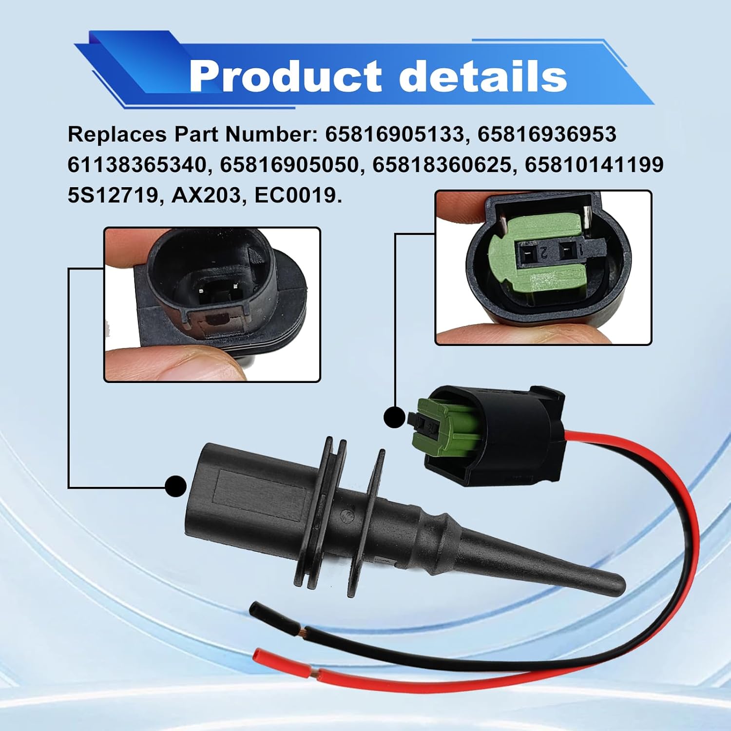 O Sensor de Temperatura do Ar Ambiente Externo é um componente essencial para o funcionamento eficiente do sistema de climatização e gerenciamento de motor de diversos modelos de veículos. Este sensor é projetado para substituir peças originais com os números de peça OE: 65816905133, 65816936953, 61138365340, 65816905050, 65818360625, 65810141199, 5S12719, AX203, EC0019. Antes da compra, é fundamental confirmar o tamanho e a compatibilidade do produto, garantindo que os conectores e plugs nas imagens correspondam aos seus produtos antigos, evitando assim compras erradas.