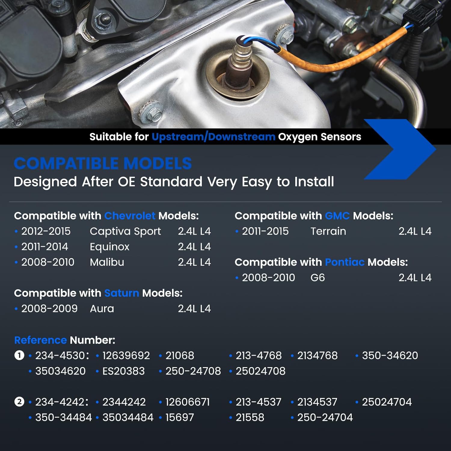 O Sensor de Oxigênio O2, modelos 234-4530 e 234-4242, é a solução ideal para quem busca eficiência e desempenho em veículos como o Chevy Captiva Sport, Equinox, Malibu, e outros modelos compatíveis. Este sensor é projetado para substituir os números de peça originais (OE) 234-4530, 12639692, 21068, 213-4768, 350-34620, entre outros, e 234-4242, 12606671, 213-4537, 350-34484, garantindo uma instalação perfeita e funcionalidade superior.