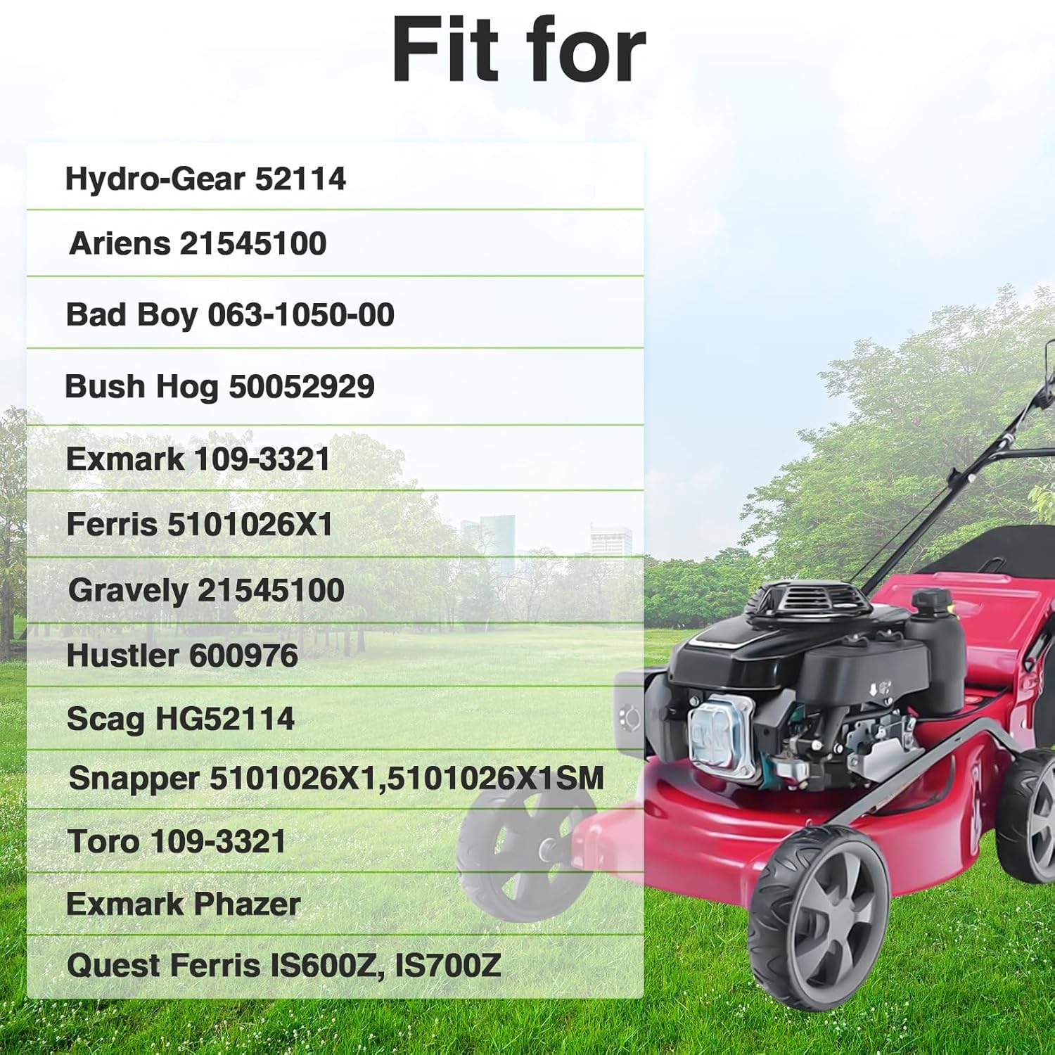 - Compatibilidade: Este filtro de óleo de transmissão é compatível com diversas marcas e modelos, incluindo Hydro-Gear 52114, Ariens 21545100, Bad Boy 063-1050-00, Bush Hog 50052929, Exmark 109-3321, Ferris 5101026X1, Gravely 21545100, Hustler 600976, Scag HG52114, Snapper 5101026X1, 5101026X1SM, Toro 109-3321, Exmark Phazer e Quest Ferris IS600Z, IS700Z.