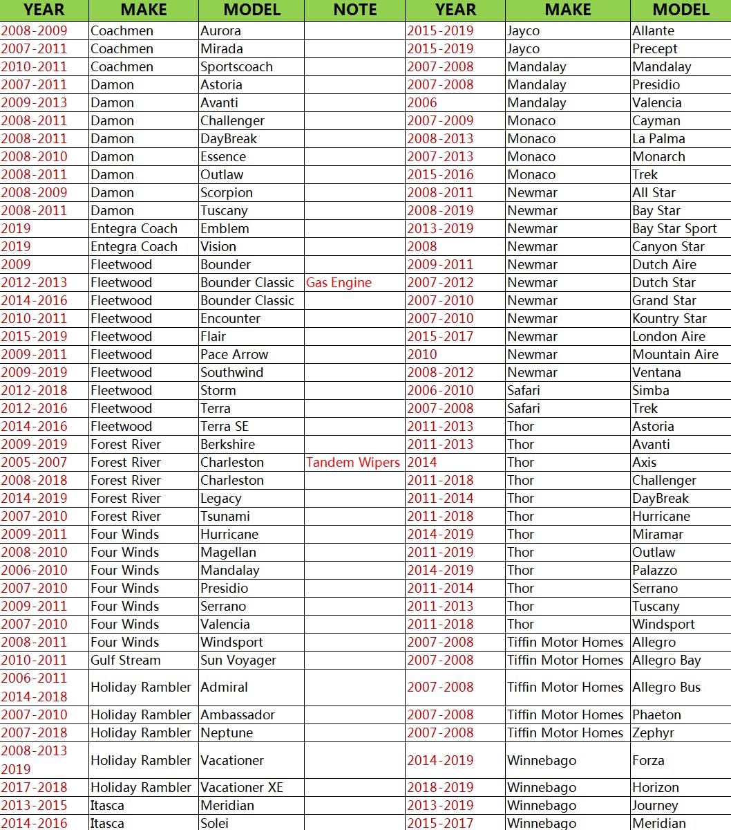 This is more about what might not be known, but apparently wiper blades come in different lengths and the frames that hold them – the j-hook part that connects to the wiper arms on your RV – are wider than what is on your vehicle. So these are good wipers, and were the correct length, but width of the connecter was not the same so I could not use them.