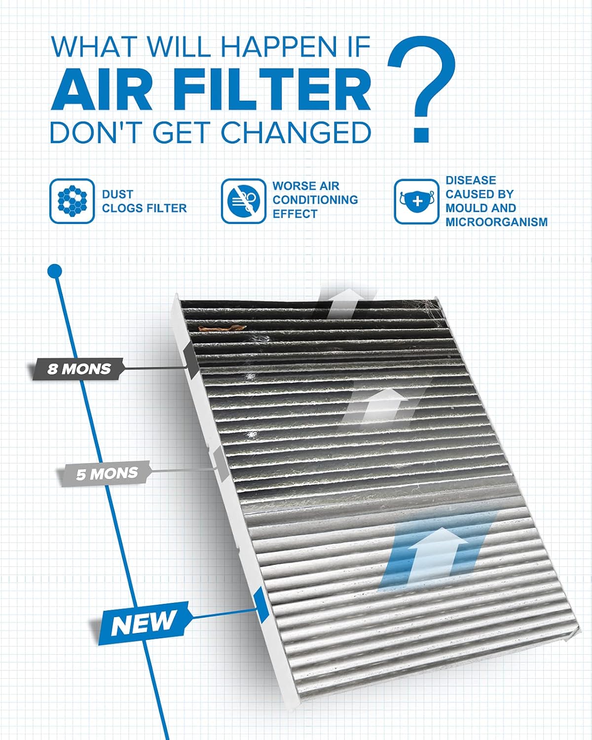- Nota: Certifique-se de que o filtro é compatível com seu veículo antes da compra. Recomendamos a troca dos filtros de cabine a cada 12.000 milhas ou conforme as recomendações do manual do proprietário. Se o filtro não for instalado na orientação correta, gire o filtro 90 graus; a orientação das pregas não afetará o fluxo de ar ou o desempenho.
