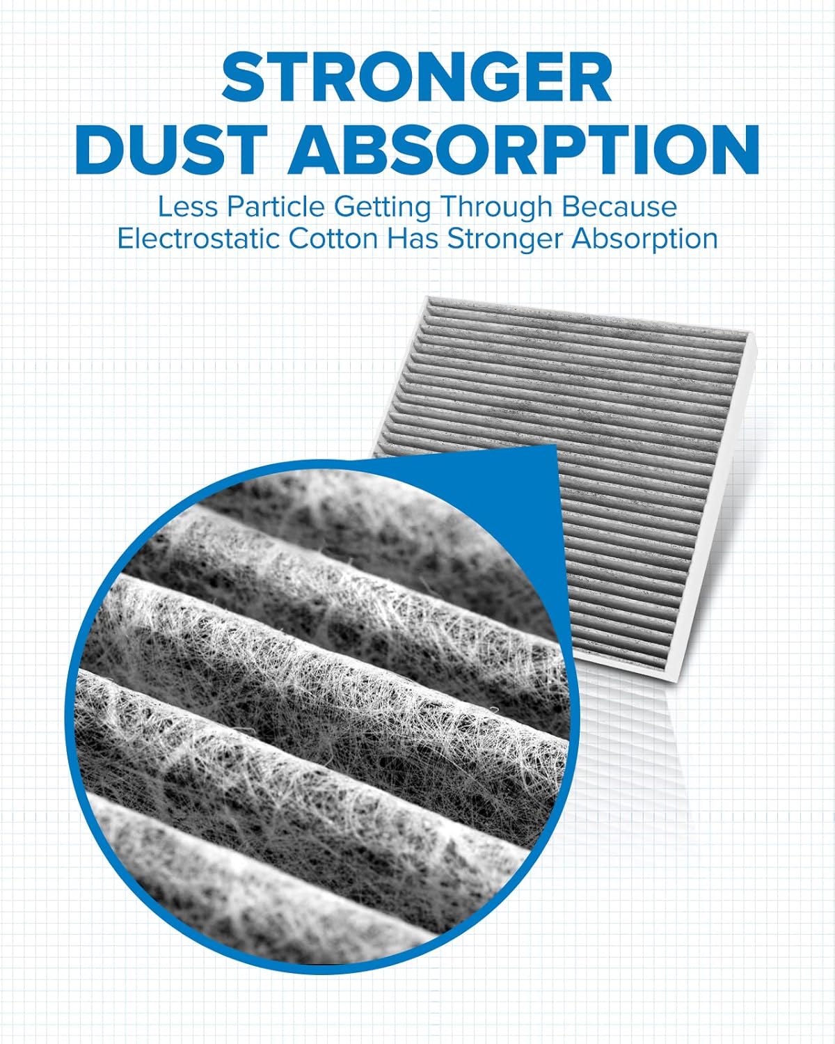- Melhora o Desempenho do HVAC: A estrutura especial da camada de algodão eletrostático de fibra longa aumenta significativamente a área de retenção de poeira em comparação com outros materiais planos. Isso proporciona passagens de ar adequadas, melhorando a eficiência de aquecimento e resfriamento do sistema HVAC e prevenindo odores mofados dentro do carro.