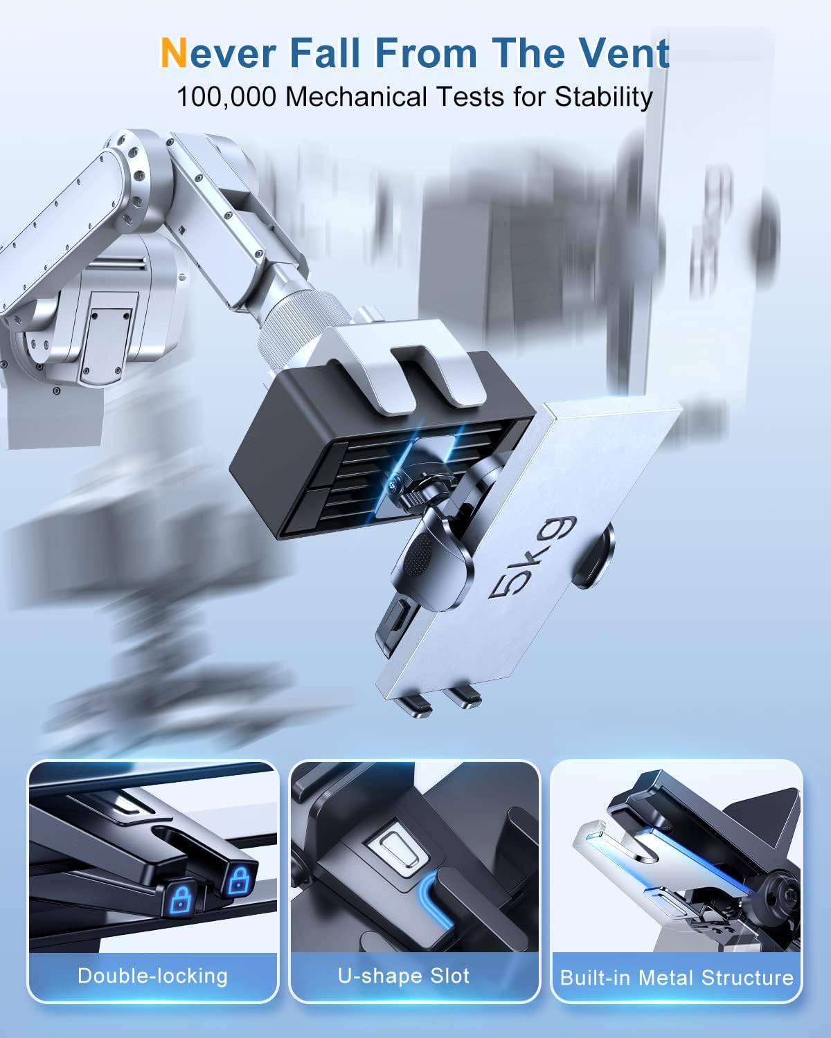 – Compatibilidade Ampla: Projetado para a maioria dos carros com saídas de ar horizontais e verticais, o suporte é capaz de acomodar smartphones de até 7,1 polegadas, além de ter uma bandeja inferior ajustável para dispositivos maiores.