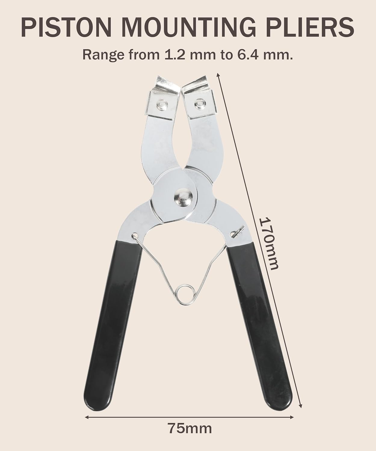 Os alicates de montagem de pistão são adequados para os diâmetros de pistão e anéis mais comuns, com espessuras variando de 3/64 polegadas a 1/4 polegadas (1,2mm a 6,4mm), garantindo que você tenha a ferramenta certa para o trabalho.