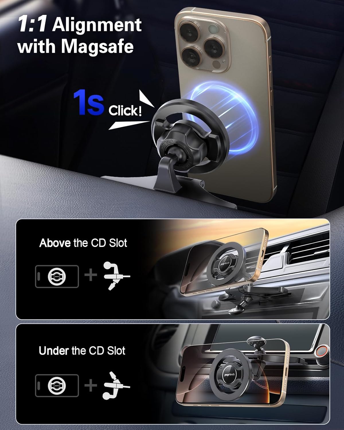My Mazda 3 is equipped with a built-in CD player. I’ve used the first generation of magnetic phone holders and they work for smaller phones such as the iPhone 5/6/7/8. However, the newer iPhones XR or 11+ are larger and fall off if you drive over a bumpy road. I decided to try out this Pop-tech with the newer MagSafe magnetic ring. My phone case has a built-in MagSafe and this works perfectly!