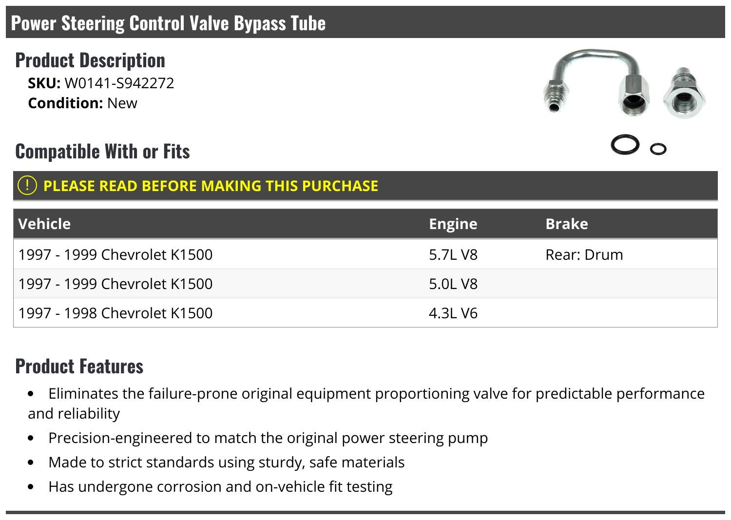 Descrição do Produto: Power Steering Control Valve Bypass Tube – Compatível com Chevy K1500 1997-1999