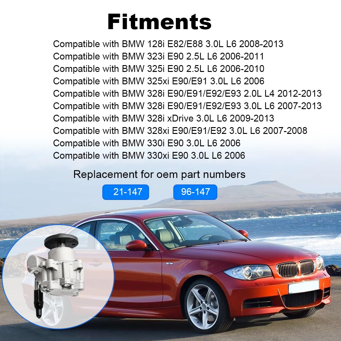 Esta bomba de direção hidráulica é compatível com os modelos BMW 128i, 323i, 325i, 325xi, 328i, 328xi, 330i e 330xi. Para uma lista mais detalhada de modelos, consulte a descrição detalhada do produto. Ela é uma substituição direta para as peças 21-147, 96-147 e 32414035682, garantindo que você tenha a peça correta para o seu veículo.