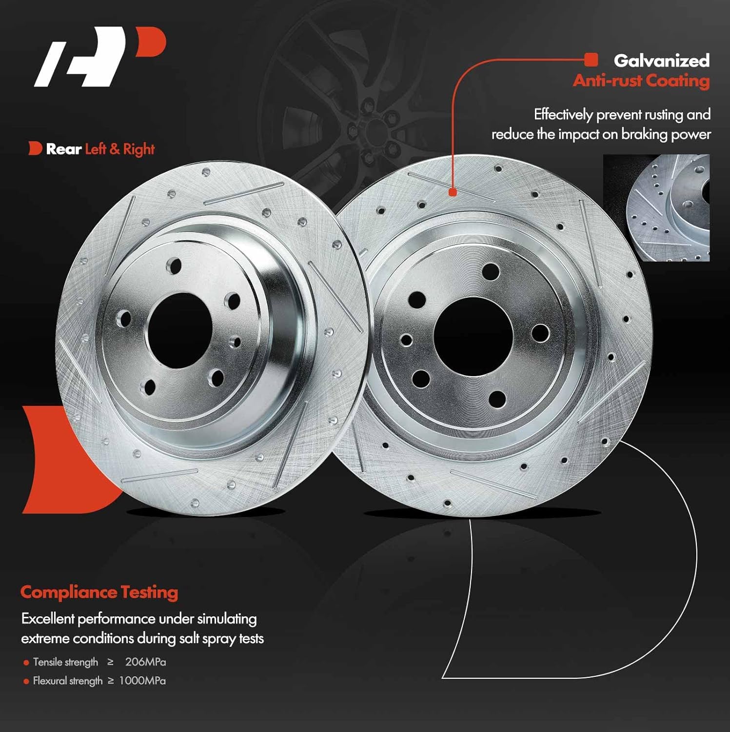 Descrição do Produto: A-Premium 11.89 inch (302mm) Rear Drilled and Slotted Disc Brake Rotors Ceramic Pads Kit