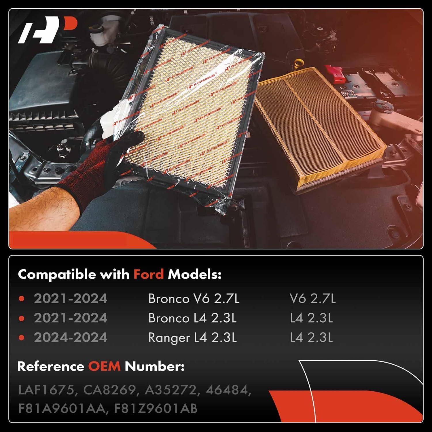 O Filtro de Ar do Motor A-Premium 2-PC é a escolha ideal para quem possui um Ford Ranger 2024 2.3L ou um Ford Bronco 2021-2024, tanto nas versões 2.3L quanto 2.7L, 4WD. Este filtro foi projetado para garantir que o motor do seu veículo receba ar limpo e livre de impurezas, contribuindo para um desempenho otimizado e uma eficiência energética superior.