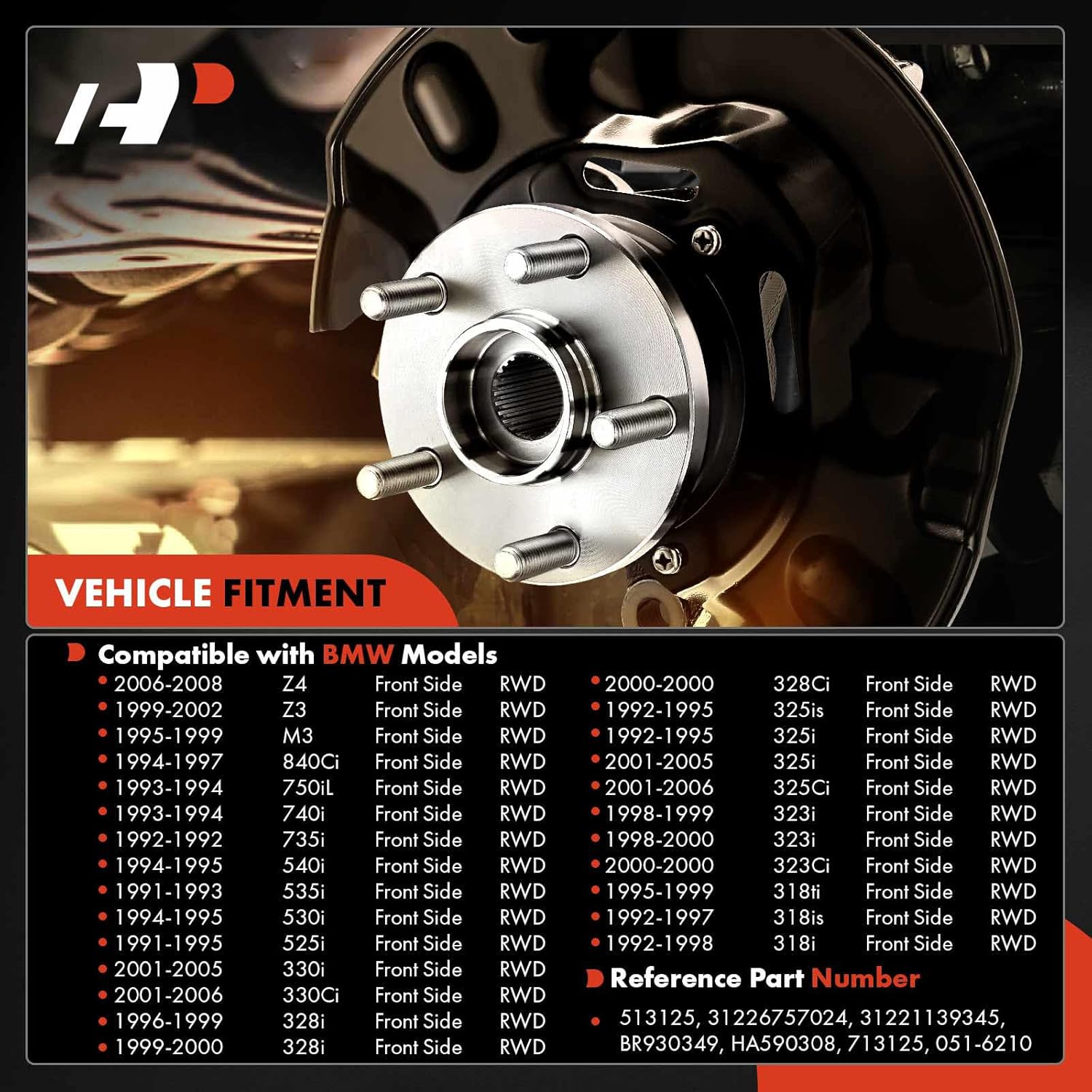 Conjunto de Rolamento e Cubo de Roda Dianteiro A-Premium 2 com Anel ABS Compatível com BMW 318i, 318is, 318ti, 323Ci, 323i, 325Ci, 325i, 325is, 328Ci, 328i, 330Ci, 330i, 525i, 530i, 535i, 540i, 735i