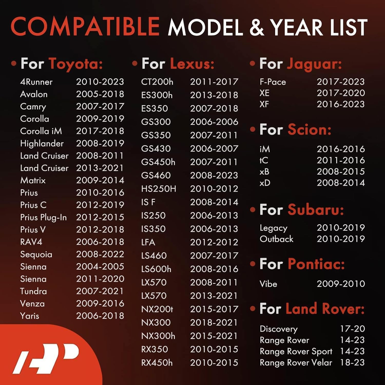 – Toyota: Camry (2007-2017), RAV4 (2006-2018), Highlander (2008-2018), Corolla (2009-2019), Sienna (2004-2005, 2011-2020), Tundra (2007-2021), Prius (2013-2016), 4Runner (2010-2022), entre outros.