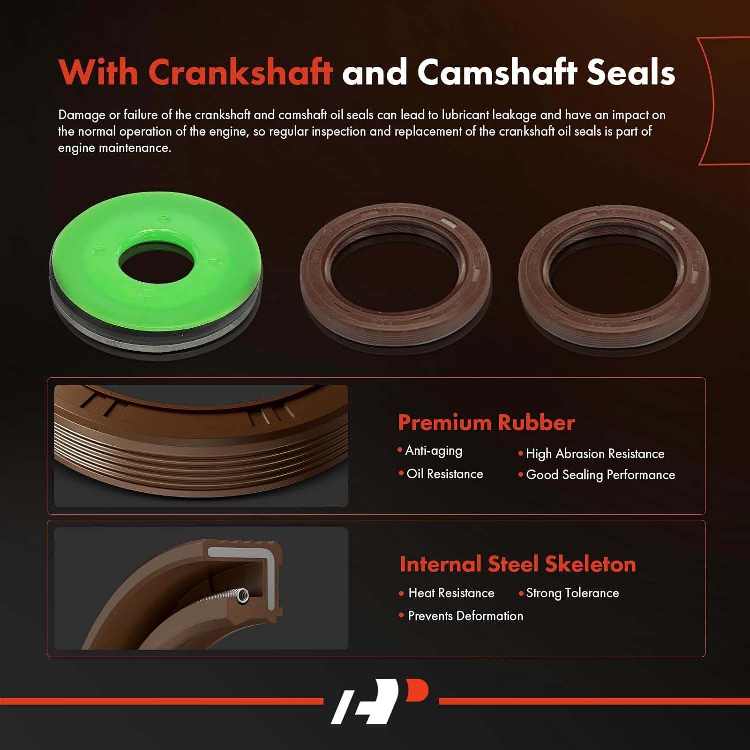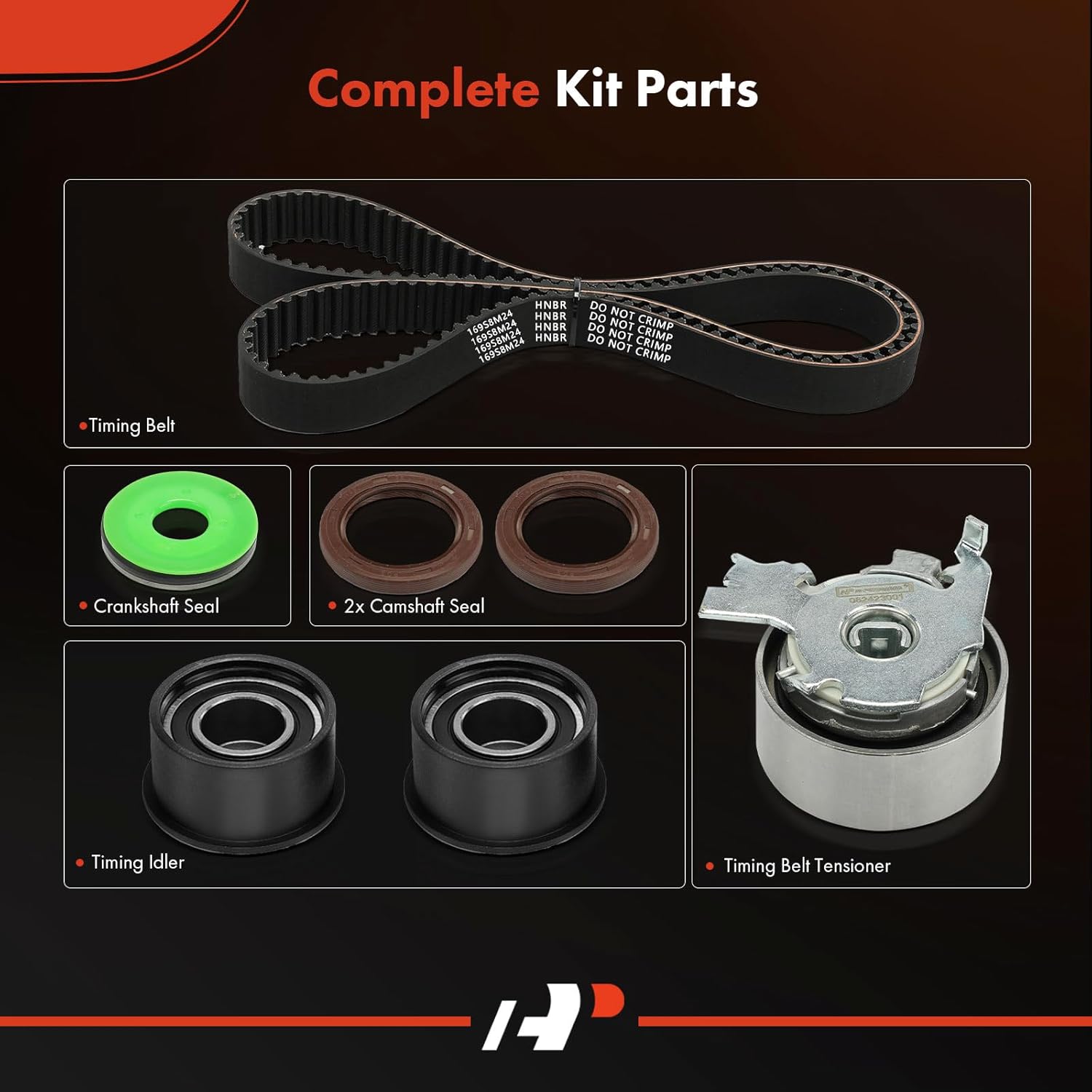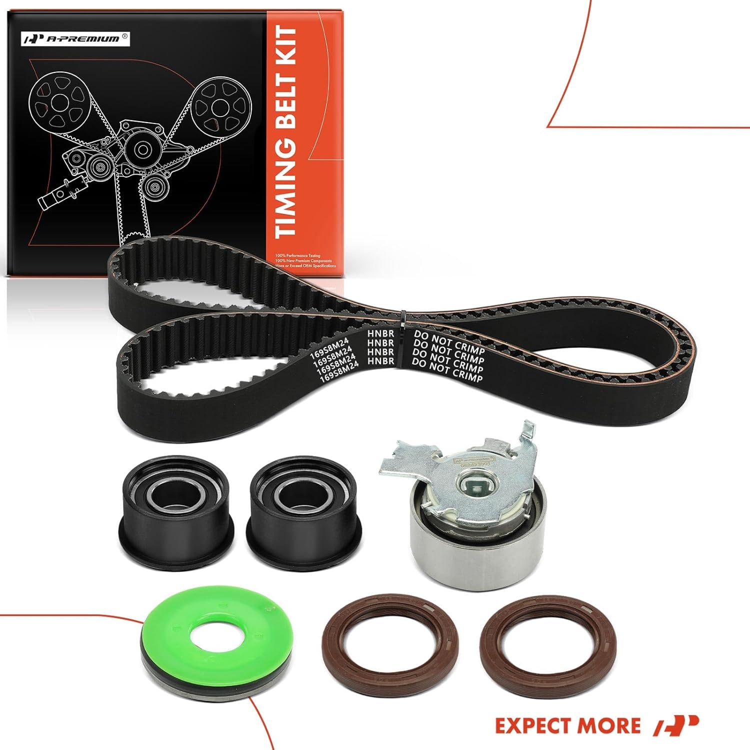 The timing belt, its tensioner, as well as pulleys are direct replacements for the components needed on my 05′ Suzuki Forenza. The two camshaft seals were also a perfect fit.