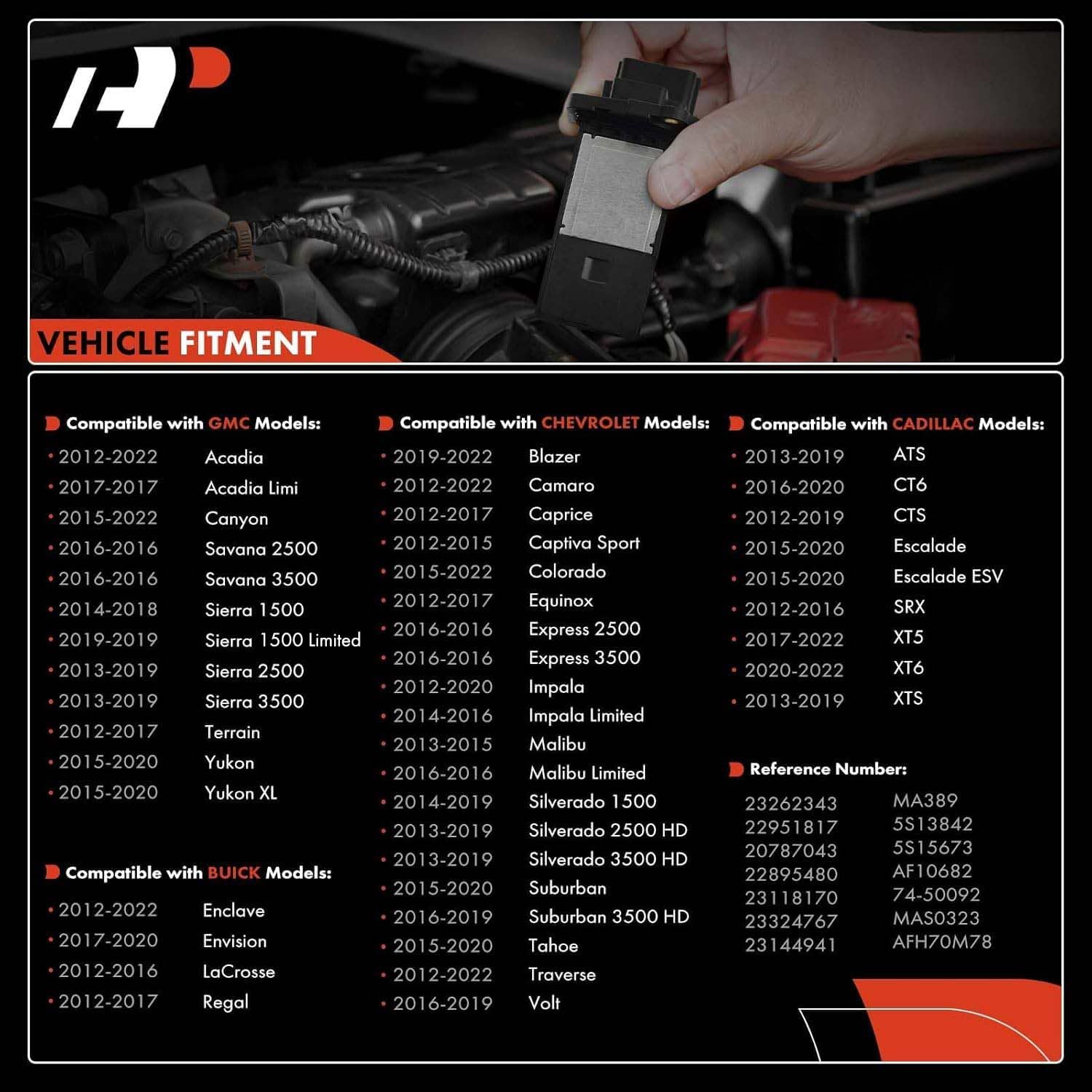 – Chevrolet: Camaro (2012-2022) [3.6L], Caprice (2012-2017) [3.6L], Colorado (2015-2022) [3.6L/2.5L], Equinox (2012-2017) [2.4L/3.6L], Impala (2012-2020) [3.6L/2.5L], Silverado 1500 (2014-2019) [5.3L/4.3L/6.2L], entre outros.