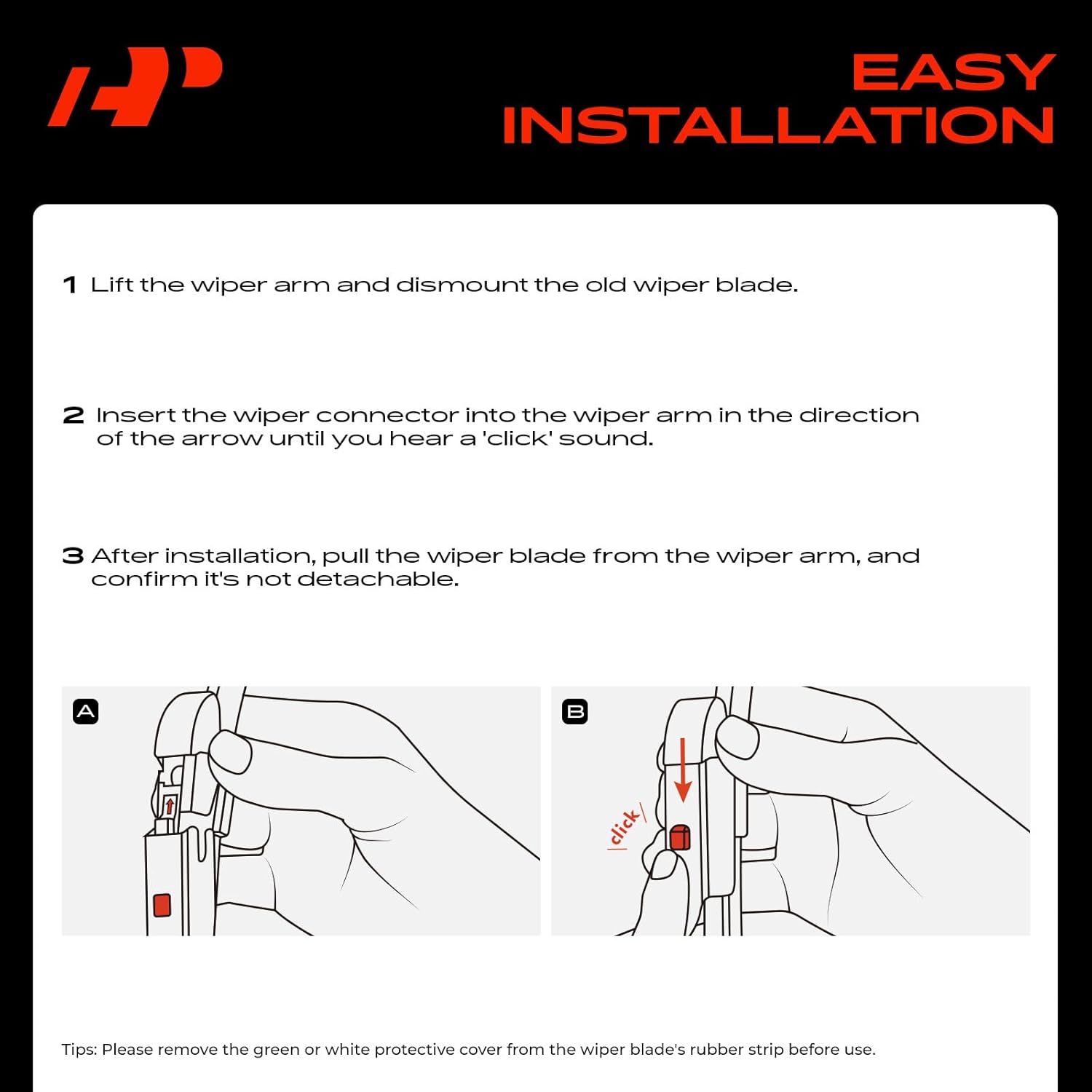 A instalação é simples e prática. O adaptador já vem pré-instalado, bastando localizar o método correspondente no manual, de acordo com os tipos de montagem e adaptadores do seu limpador. Lembre-se de remover o protetor da palheta antes do uso e utilize a toalha incluída para proteger o para-brisa durante a instalação.
