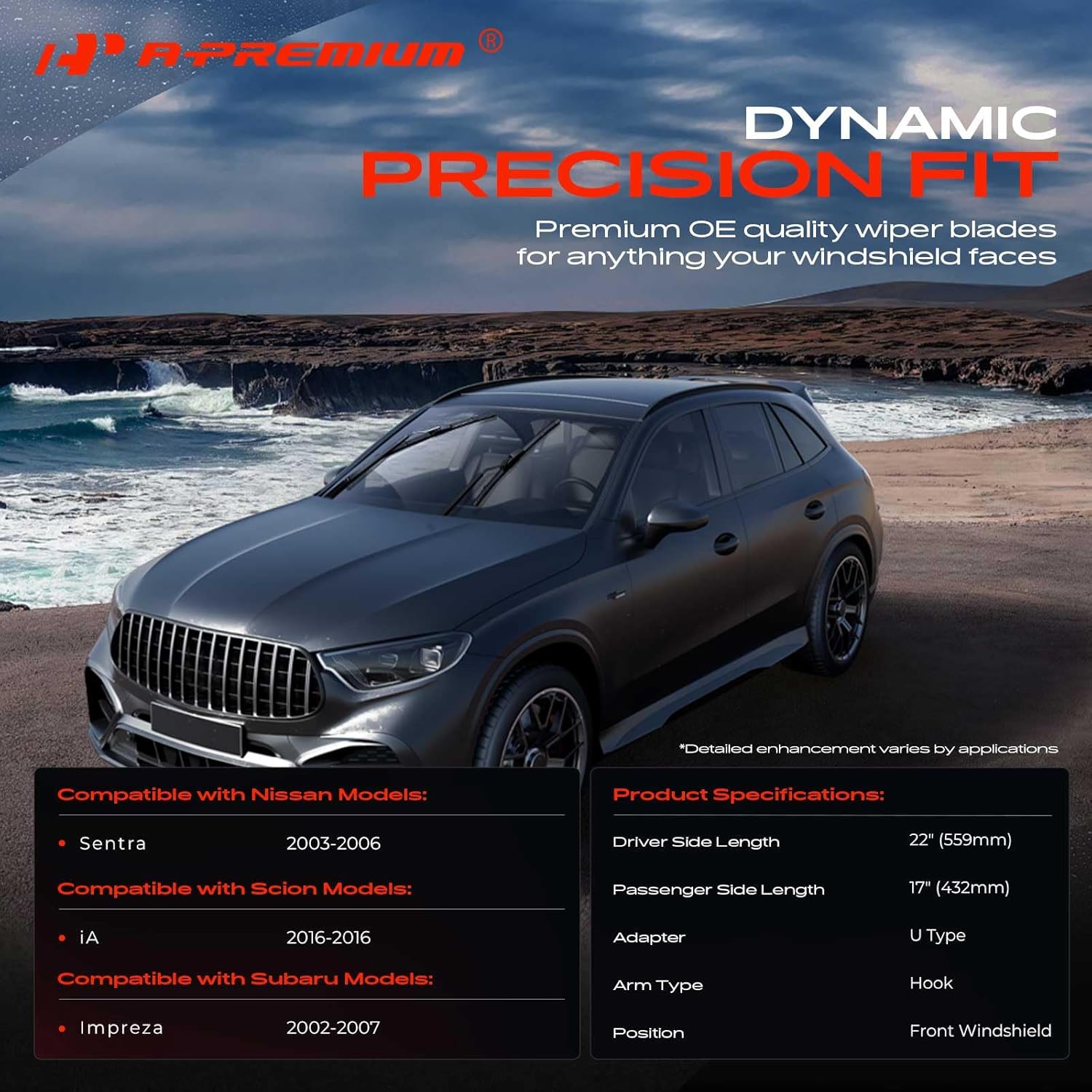 Apresentamos as Lâminas de Limpador de Para-brisa Dianteiro A-Premium, um pacote com 2 unidades que combina inovação e eficiência para garantir a melhor visibilidade e segurança durante suas viagens. Compatíveis com veículos como Nissan Sentra (2003-2006), Subaru Impreza (2002-2007) e Scion iA (2016), essas palhetas são projetadas para atender às exigências dos motoristas mais exigentes. O conjunto inclui uma palheta de 22 polegadas para o lado esquerdo e uma de 17 polegadas para o lado direito, ambas com montagem do tipo gancho e adaptador tipo U, facilitando a instalação.