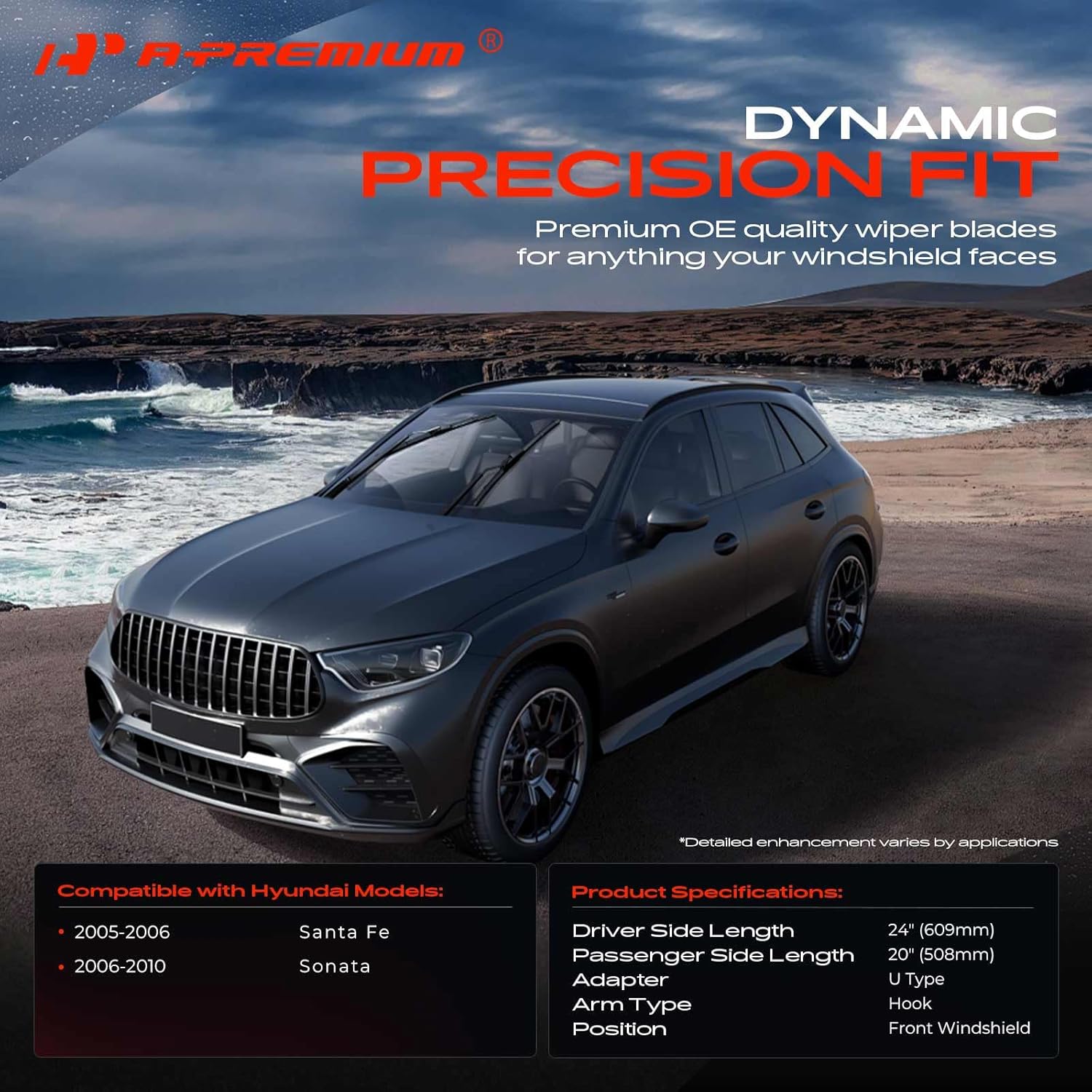 Apresentamos o A-Premium Pack de 2 Palhetas de Limpador de Para-brisa Frontais com Indicador de Desgaste, a escolha ideal para proprietários de Hyundai Sonata (2006-2010) e Santa Fe (2005-2006). Com um comprimento de 24 polegadas (esquerda) e 20 polegadas (direita), essas palhetas são projetadas para se encaixar perfeitamente em seu veículo, utilizando um tipo de montagem de gancho e um adaptador do tipo U. O pacote inclui 2 palhetas de limpador, 1 manual de instalação e 1 toalha para facilitar o processo.