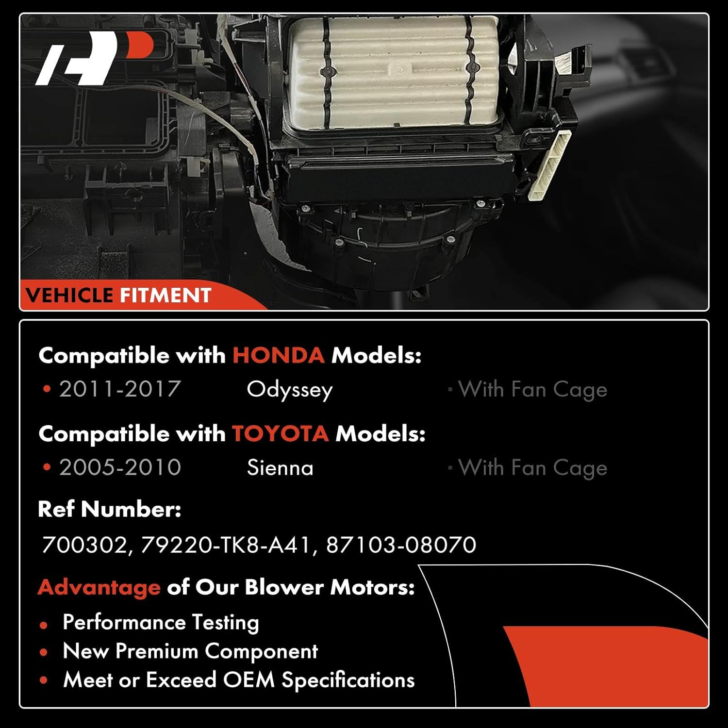 Resposta: O A-Premium Rear HVAC Heater Blower Motor Assembly é compatível com Honda Odyssey 2011-2017 e Toyota Sienna 2005-2010. Para verificar a compatibilidade com outros modelos, consulte os números de referência listados.