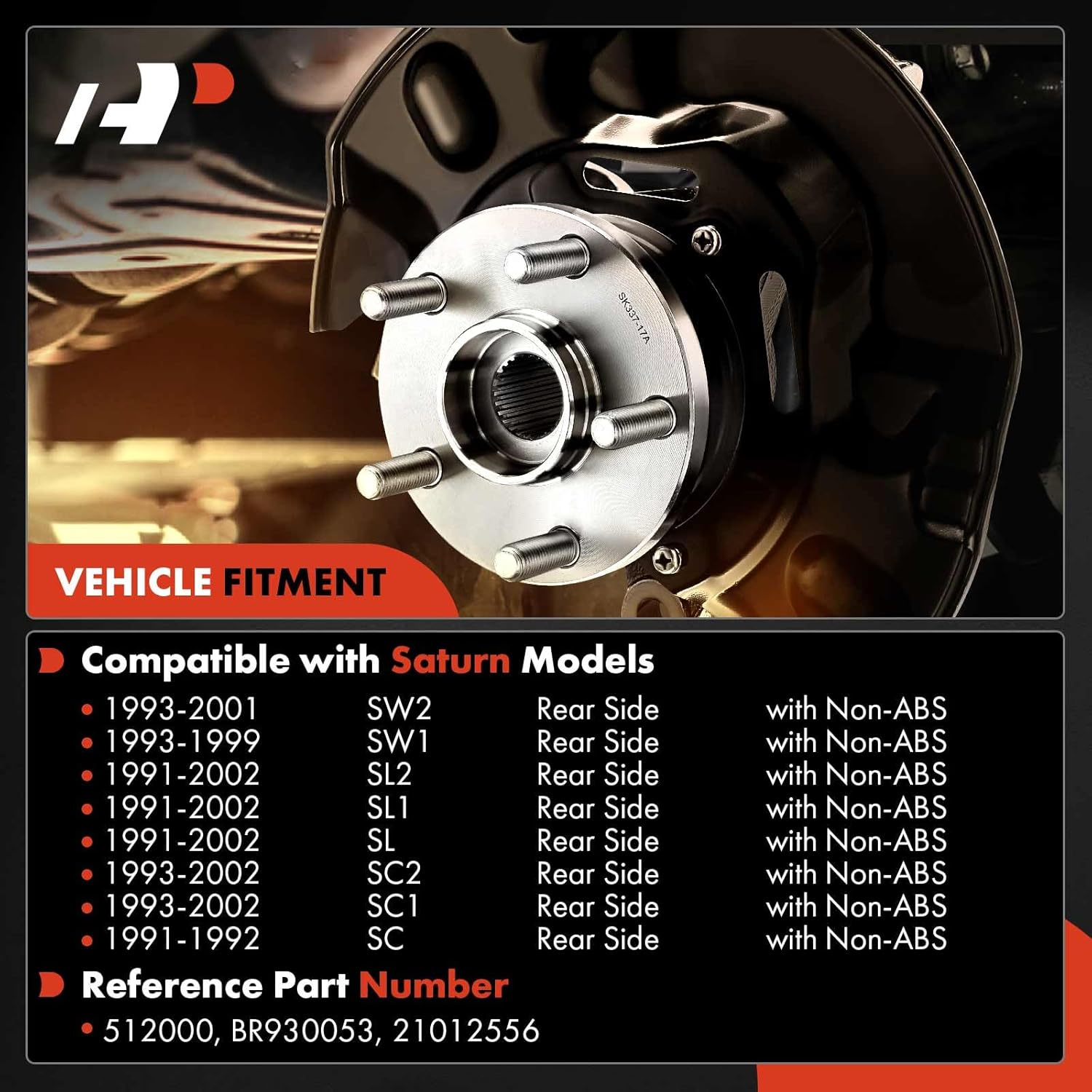 Descrição do Produto: Conjunto de Rolamento e Cubo de Roda Traseiro A-Premium com 4 Furos Compatível com Saturn SC 1991-1992, SC1 SC2 1993-2002, SL SL1 SL2 1991-2002, SW1 1993-1999, SW2 1993-2001, Não ABS