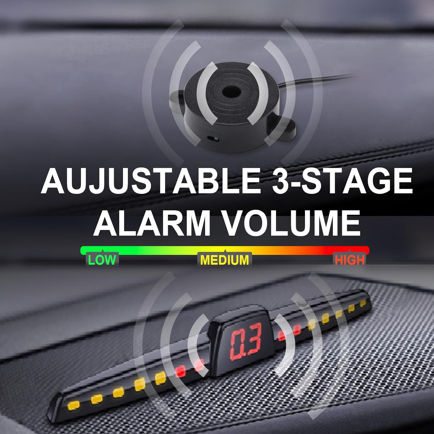 Uma das características mais notáveis do PS02 é o volume de alarme ajustável. Você pode personalizar o volume do alarme em três níveis: baixo, médio e alto, permitindo que você tenha uma compreensão clara da distância até os obstáculos próximos sempre que estiver em marcha ré. Além disso, o sistema possui um alcance de detecção estendido, que pode ser ajustado em 20 cm ou 40 cm para acomodar saliências traseiras, como pneus sobressalentes, garantindo uma cobertura abrangente.