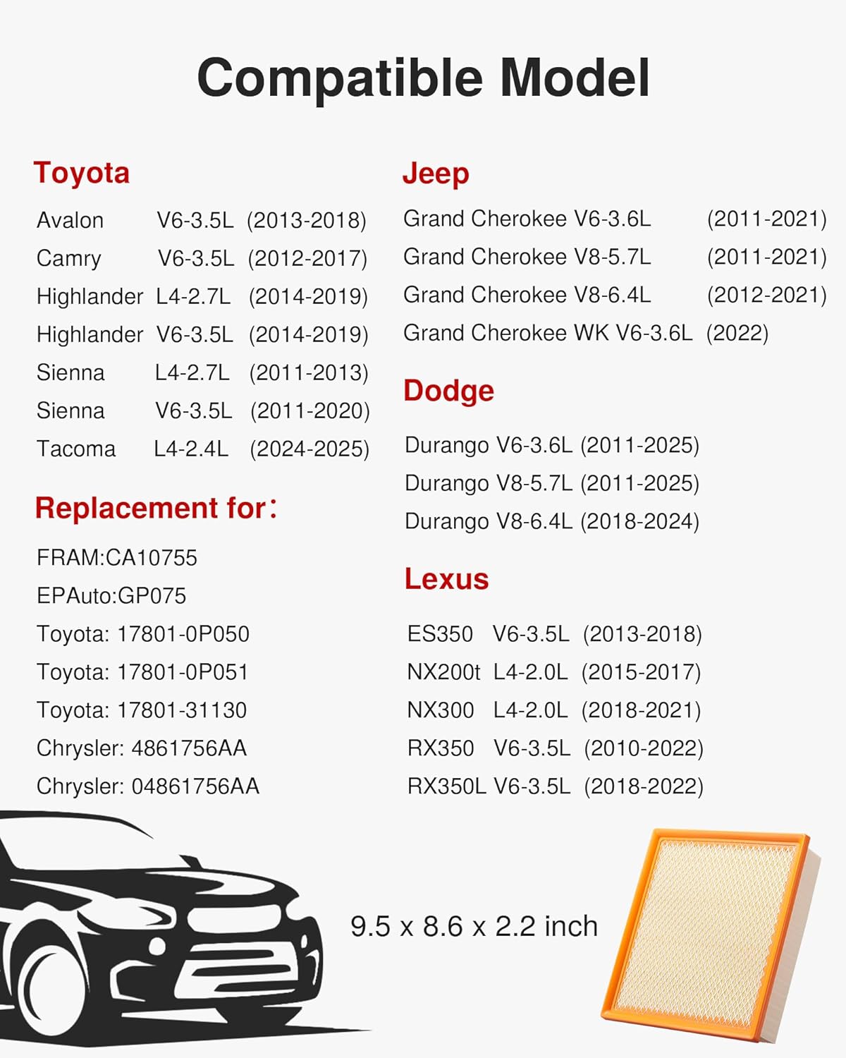- Lista de Veículos Compatíveis: Toyota: Avalon V6-3.5L (2013-2018), Camry V6-3.5L (2012-2017), Highlander L4-2.7L (2014-2019), Highlander V6-3.5L (2014-2019), Sienna L4-2.7L(2011-2013), Sienna V6-3.5L(2011-2020), Tacoma L4-2.4L(2024-2025). Lexus: ES350 V6-3.5L (2013-2018), NX200t L4-2.0L (2015-2017), NX300 L4-2.0L(2018-2021), RX350 V6-3.5L(2010-2022), RX350L V6-3.5L(2018-2022). Jeep: Grand Cherokee V6-3.6L (2011-2021), Grand Cherokee V8-5.7L (2011-2021), Grand Cherokee V8-6.4L (2012-2021), Grand Cherokee WK V6-3.6L(2022). Dodge: Durango V6-3.6L (2011-2025), Durango V8-5.7L (2011-2025), Durango V8-6.4L (2018-2024).
