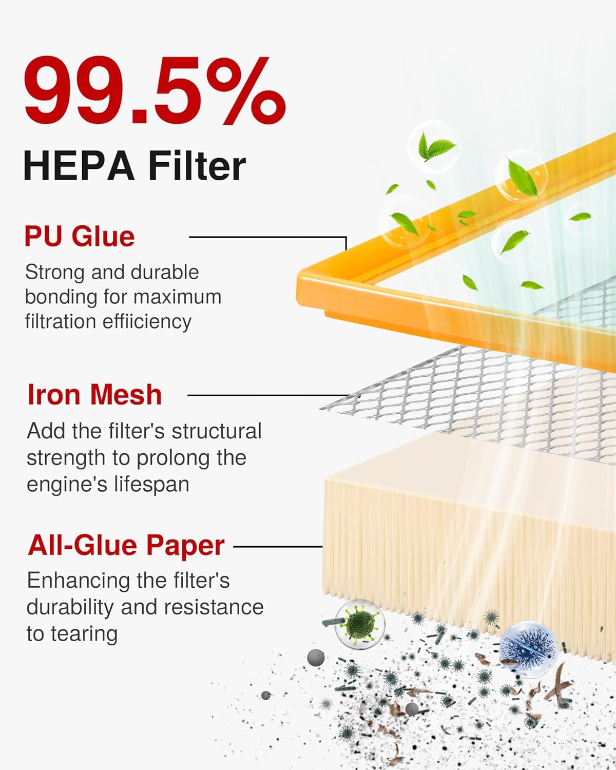 - Construção Durável: Com papel filtrante de alta qualidade e construção totalmente colada, o filtro garante uma excelente retenção de partículas, aprisionando até os menores contaminantes e evitando que entrem no motor. A malha de ferro proporciona suporte adicional ao meio filtrante, mantendo sua forma e integridade sob condições de alto fluxo de ar.
