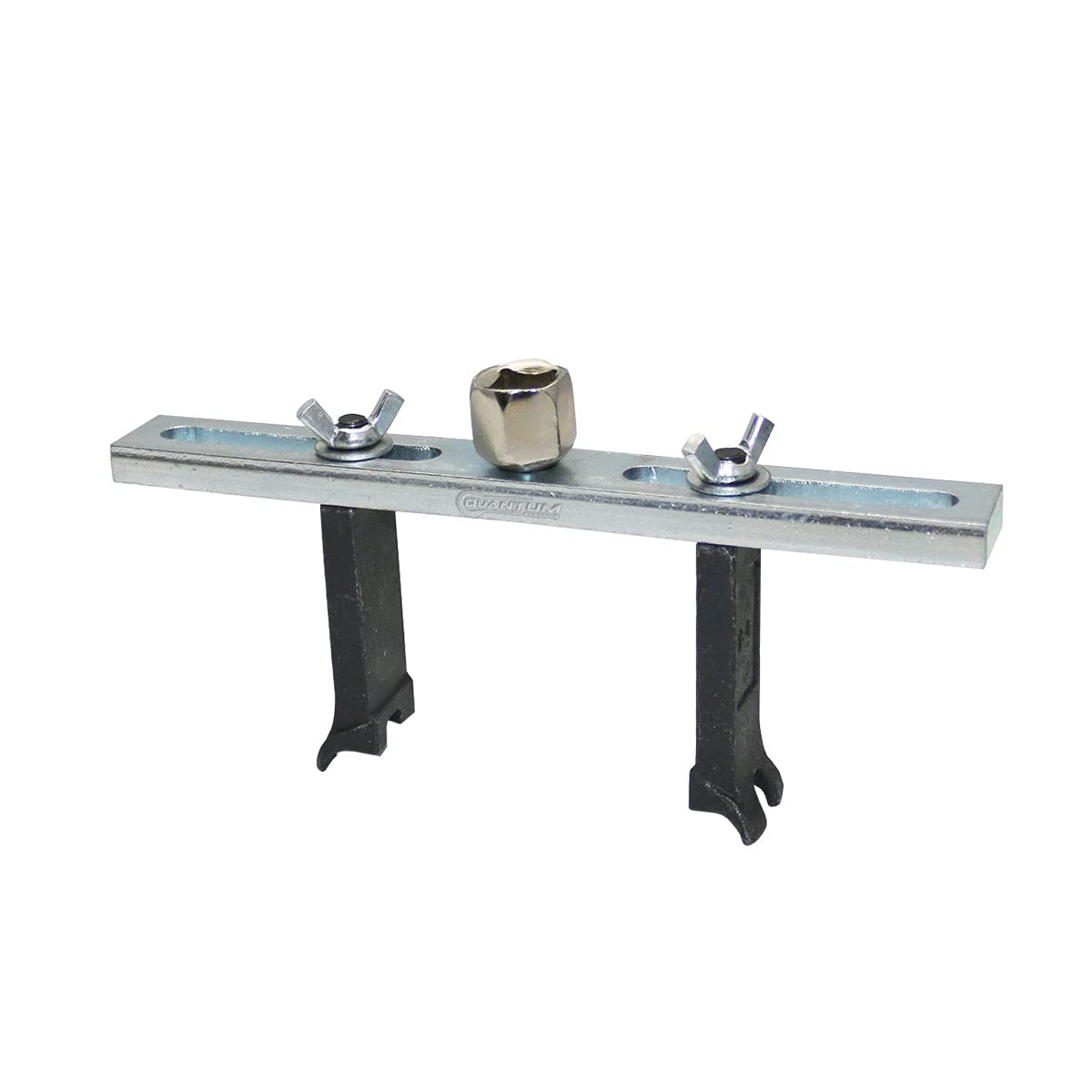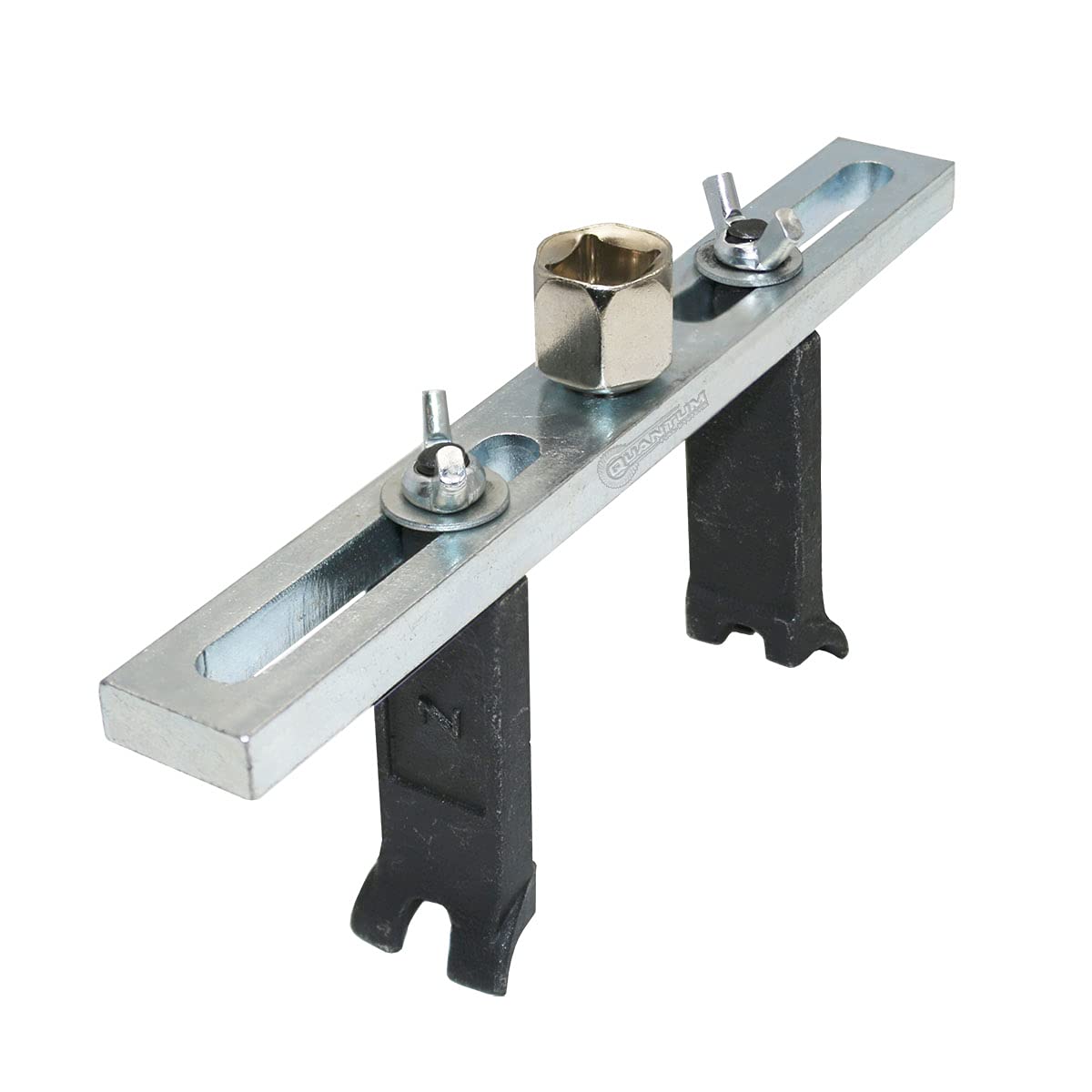 This tool is designed for the rounded edge plastic fuel pump lock rings. It is built heavy with cast iron legs and a very solid crossbar. The build quality is very good. It is adjustable from about 3″ to nearly 8″ wide. The arms are adjustable with wing nuts and once tightened down it is very solid. This tool is very useful and will remove and install the plastic ring without damage rather than using a hammer and flat blade screwdriver. It has a 3/8″ square drive in the crossbar but also includes an adapter for 1/2″ square drive or 21mm hex.