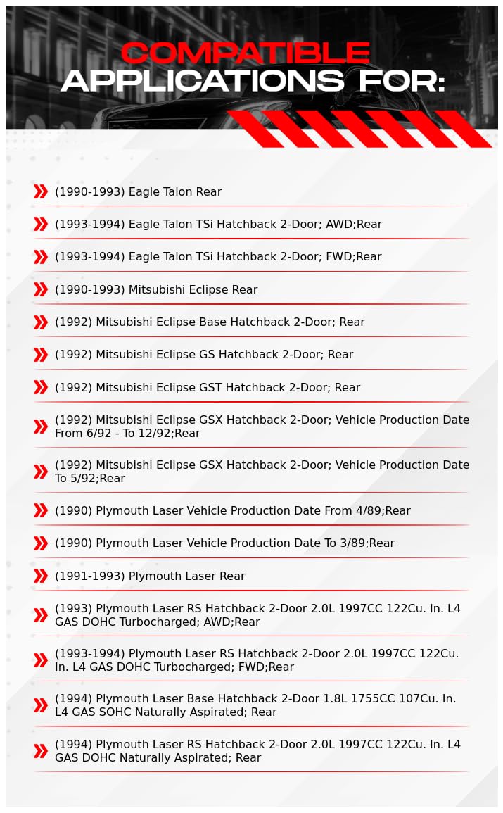Resposta: Este kit foi projetado especificamente para os modelos Eagle Talon e Mitsubishi Eclipse de 1990 a 1994. Para outros veículos, consulte as especificações do fabricante.