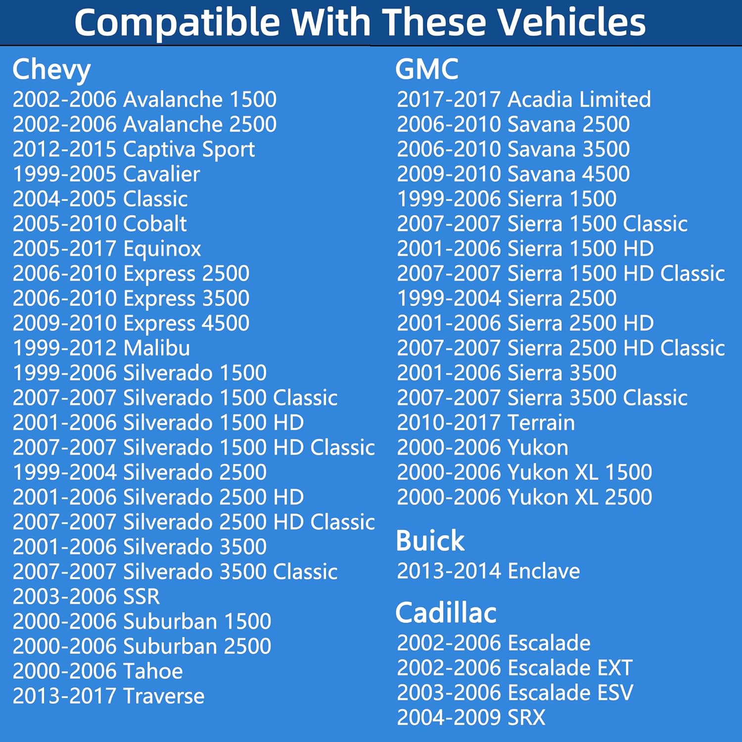 – Compatível com Buick e Cadillac: Funciona perfeitamente com o Enclave (2013-2014) e a linha Escalade (2002-2006).