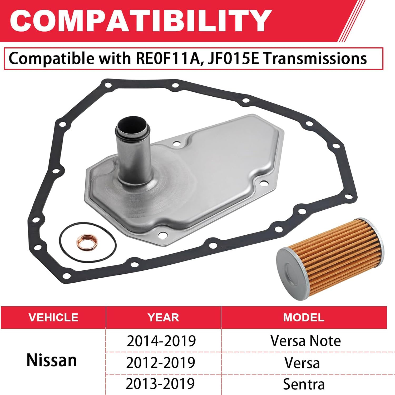 - Compatível: O Kit de Filtro de Óleo da Transmissão é compatível com transmissões RE0F11A e JF015E. É adequado para veículos Nissan: 2014-2019 Versa Note; 2012-2019 Versa; 2013-2019 Sentra.
