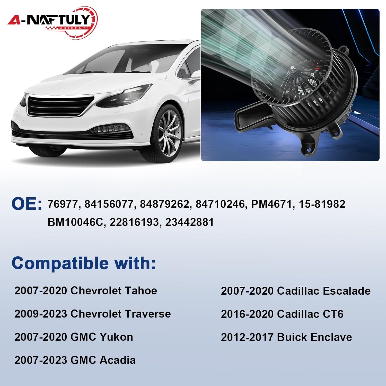 O Ventilador do Motor do Blower Traseiro é a solução ideal para quem busca eficiência e conforto em seu veículo. Compatível com uma ampla gama de modelos, incluindo o Chevrolet Traverse (2009-2023), Chevy Tahoe (2007-2020), GMC Acadia (2007-2023), Yukon (2007-2020), Cadillac Escalade (2007-2020), Cadillac CT6 (2016-2020) e Buick Enclave (2012-2017), este produto é um substituto direto para as peças OEM, como 76977, 84156077, 84879262, entre outros.