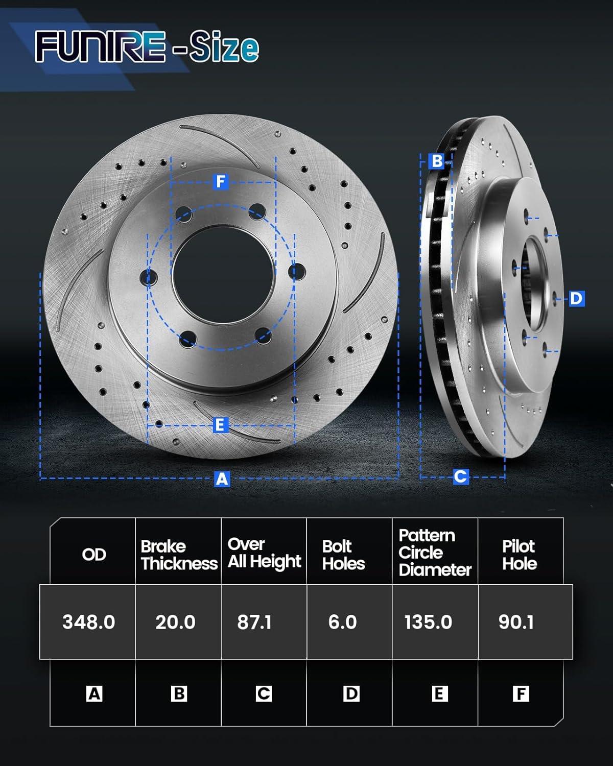 O kit inclui 2 discos de freio traseiros perfurados e canalizados (54111) e 4 pastilhas de freio cerâmicas (hardware incluído – D1012-7916). Os discos possuem um diâmetro de 348mm (13.7in), garantindo uma área de contato ideal para um desempenho de frenagem eficaz.