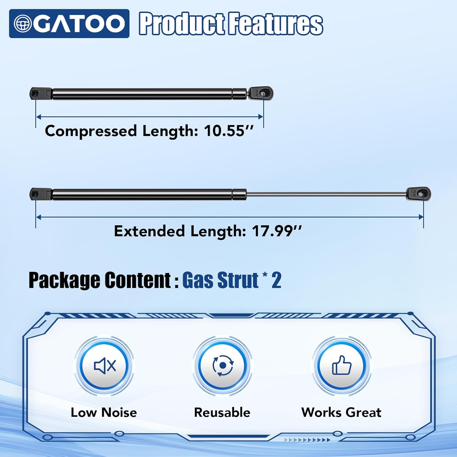 • [Conteúdo da Embalagem]: O pacote inclui dois amortecedores a gás, com comprimento estendido de 17,99 polegadas, comprimento comprimido de 10,55 polegadas e comprimento de curso de 7,44 polegadas, oferecendo as medidas exatas para um funcionamento eficaz.