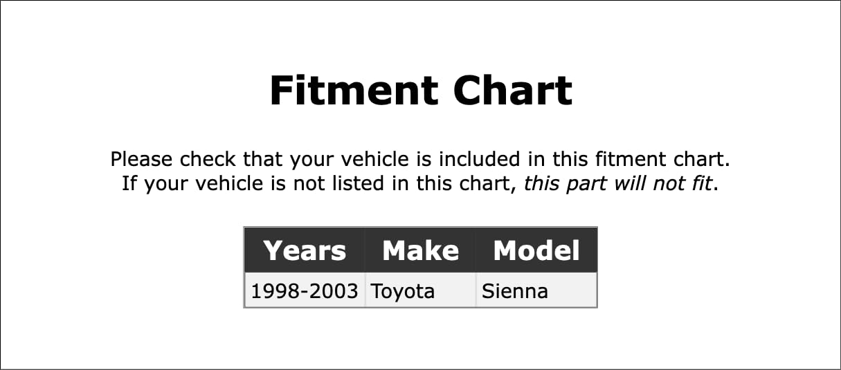 – Modelo Compatível: Toyota Sienna 1998, 1999, 2000, 2001, 2002, 2003.