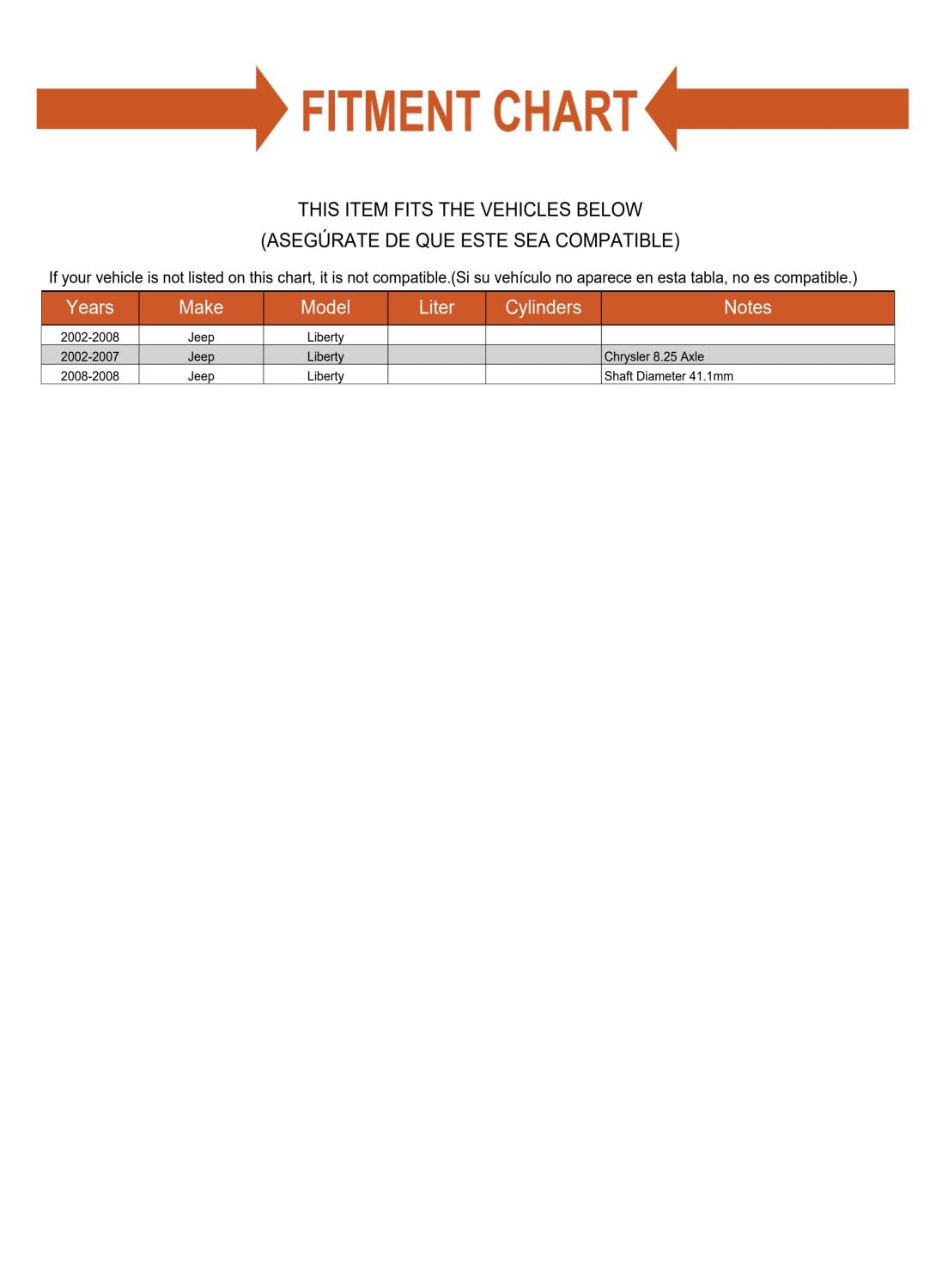 – Compatibilidade: Projetado especificamente para Jeep Liberty 2002-2008 com eixo Chrysler 8.25.