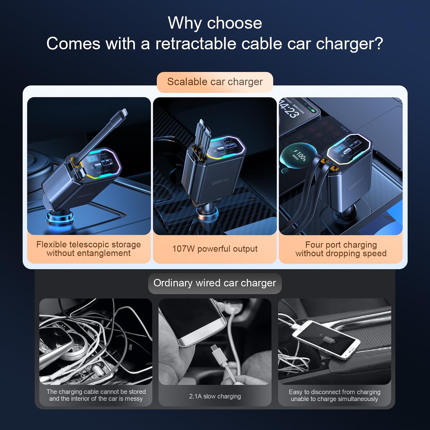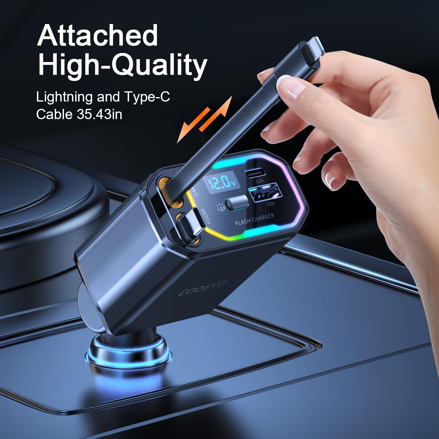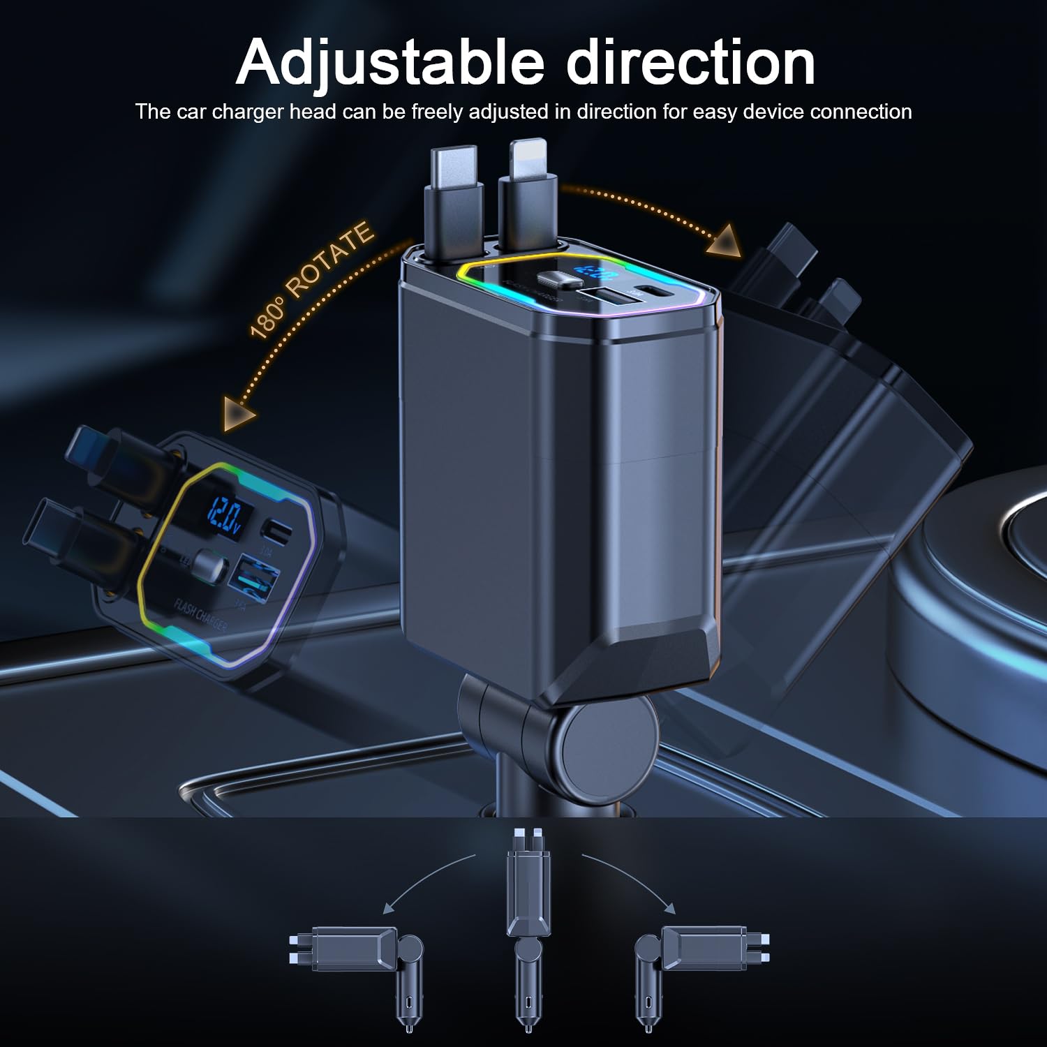– [Design Retrátil e Poderoso de 35,43 Polegadas] – O Carregador Veicular Retrátil 4 em 1 se adapta perfeitamente ao interior do seu carro. Com suporte para rotação de 180°, ele se encaixa em acendedores de cigarros com largura de 0,79 polegadas e profundidade de 2,76 polegadas. O cabo retrátil se estende até 35,43 polegadas, tornando-o ideal para acessórios de caminhões ou carros. Seu design compacto economiza espaço, mas é importante garantir espaço suficiente ao redor do acendedor, especialmente perto dos porta-copos, para um uso ideal.