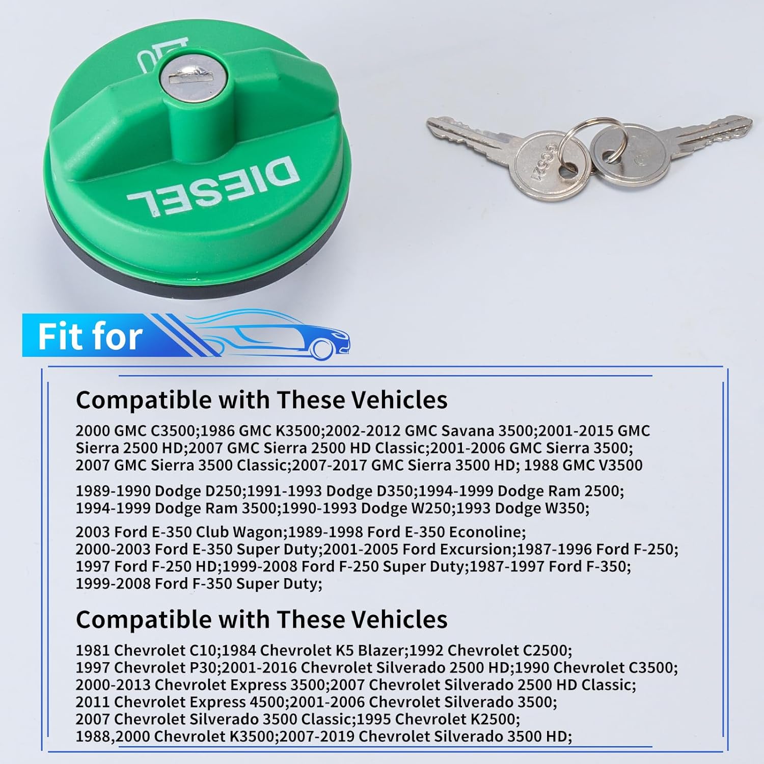 I bought these green locking caps because of a young kid mistake in Oregon. A year back I pulled the gas station in my F350 diesel dually truck & the young kid who has to pump the fuel in Oregon. I told the kid to fill it up & I went into the store. I came back out & the kid handed the receipt to me & I read it & it said gas, Not Diesel! I ask the kid to show me what fuel nozzle he use to fill up my truck. Yup gas! The kid did not know by the loud noise of a diesel truck & there is nothing saying diesel on the fuel caps. I was parked at the green or yellow nozzle. $200 bucks later, my tank was pumped out & diesel was in my tank. The station paid the bill! I am so glad I found these green diesel locking caps! Learn from my mistake! Piece of mind, the fuel cap will speak for me!