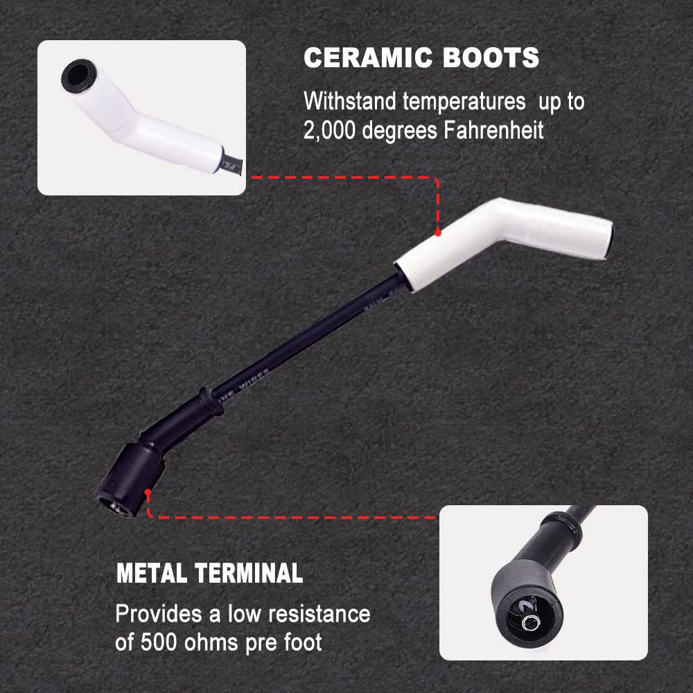 Os fios de velas são robustos e garantidos para suportar temperaturas extremamente altas e abrasão excessiva por longos períodos. As botas cerâmicas suportam temperaturas de até 2.000 graus Fahrenheit, enquanto os fios pretos de silicone duplo de 8,0 mm são classificados para 600 graus Fahrenheit, assegurando que seu motor funcione de maneira ideal, mesmo nas condições mais severas.
