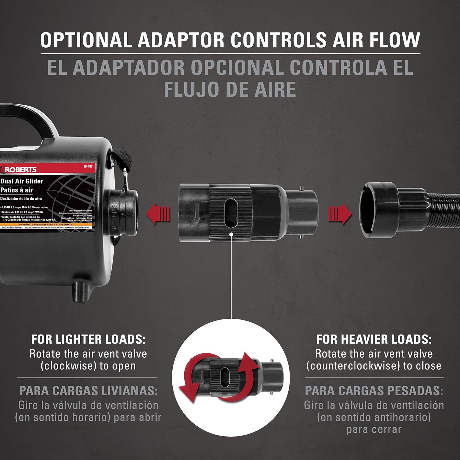 Além disso, o adaptador opcional permite o controle do fluxo de ar, ajustando a inflação das plataformas de acordo com a carga ou o espaço disponível. Essa versatilidade torna o ROBERTS Dual Air Glider uma ferramenta indispensável para qualquer operação que exija transporte de cargas pesadas de maneira eficiente e segura.