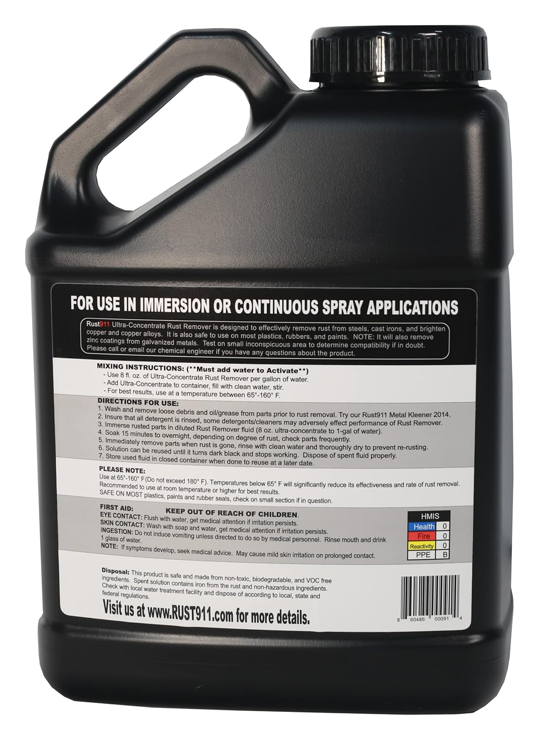 Para utilizar o Rust911, prepare a solução misturando 8 oz do concentrado em 1 galão de água. Aplique a solução em peças metálicas oxidadas por meio de imersão ou submersão. É importante não borrifar o produto diretamente sobre a ferrugem, pois isso comprometerá a eficácia do removedor. Após a imersão, enxágue bem com água limpa. O produto é estável em ciclos de congelamento e descongelamento, facilitando o armazenamento e a aplicação.